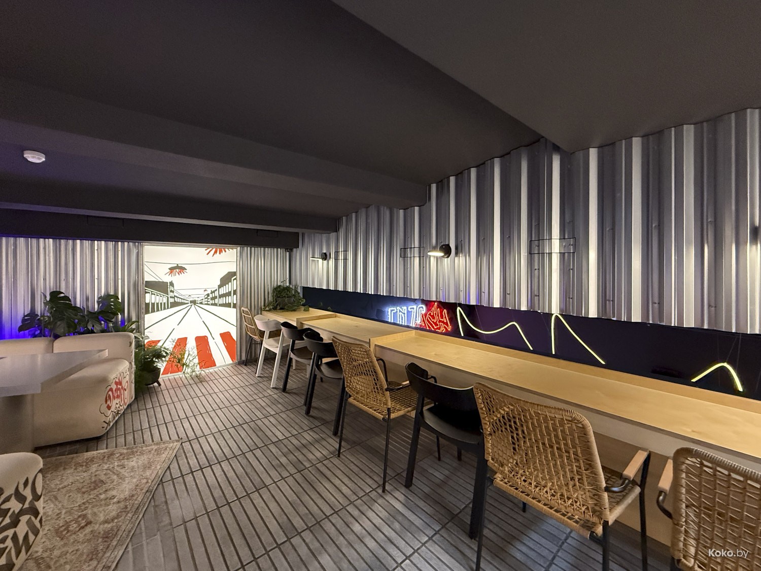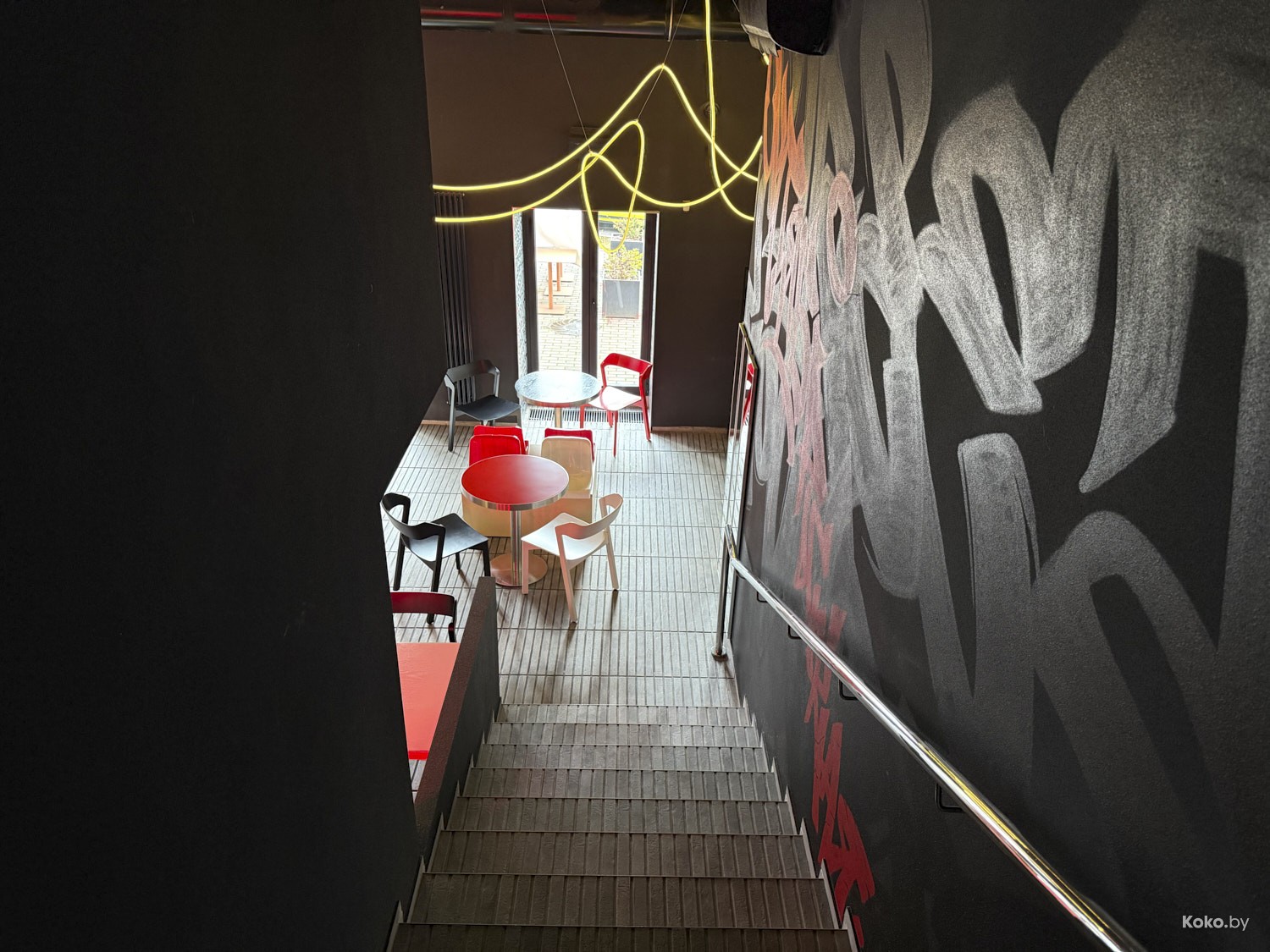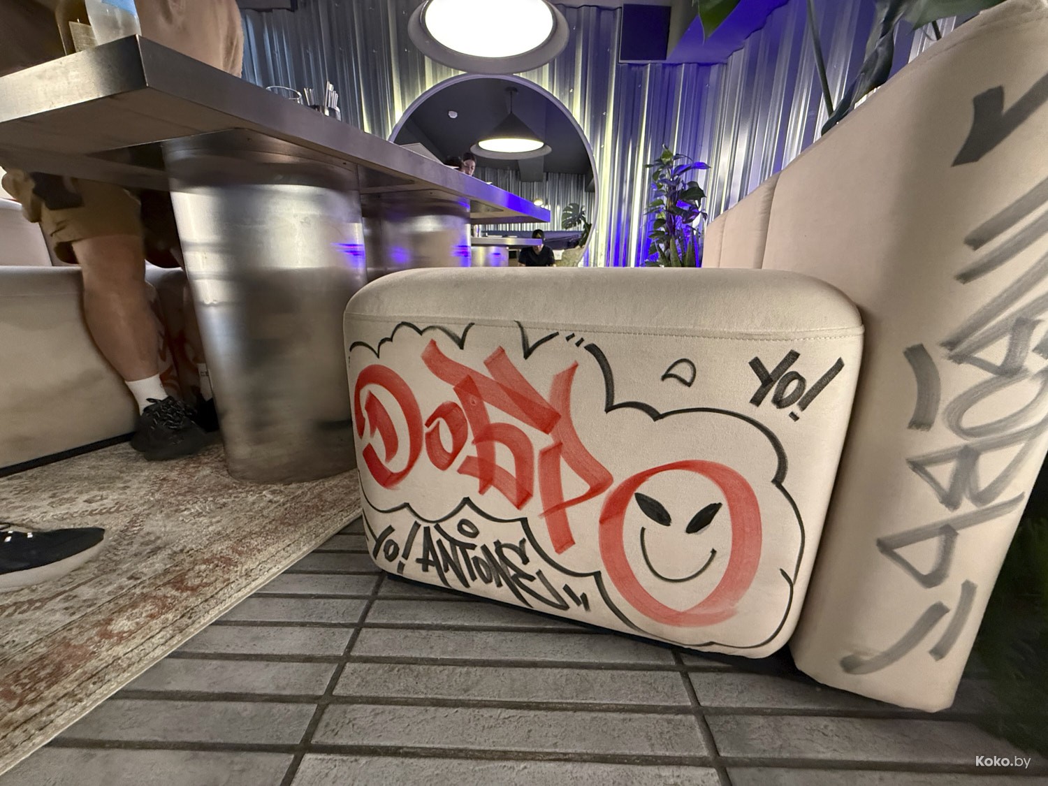 Модно, пёстро, молодёжно, расписанные баллончиками стены, пластиковые кресла с футбольной трибуны прикручены к доскам.