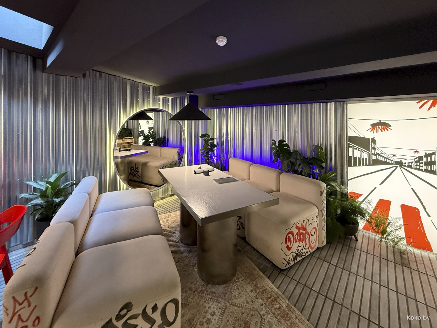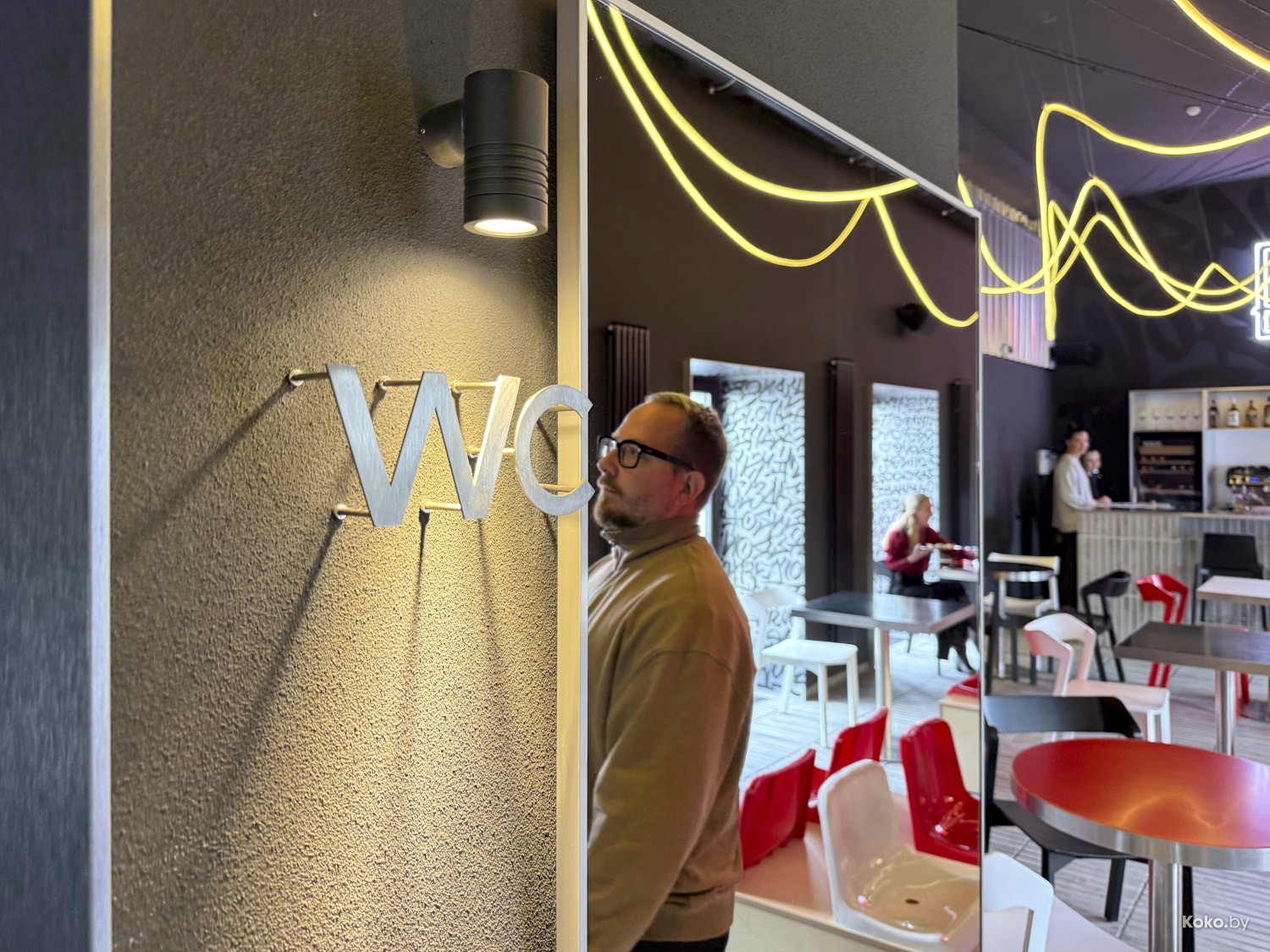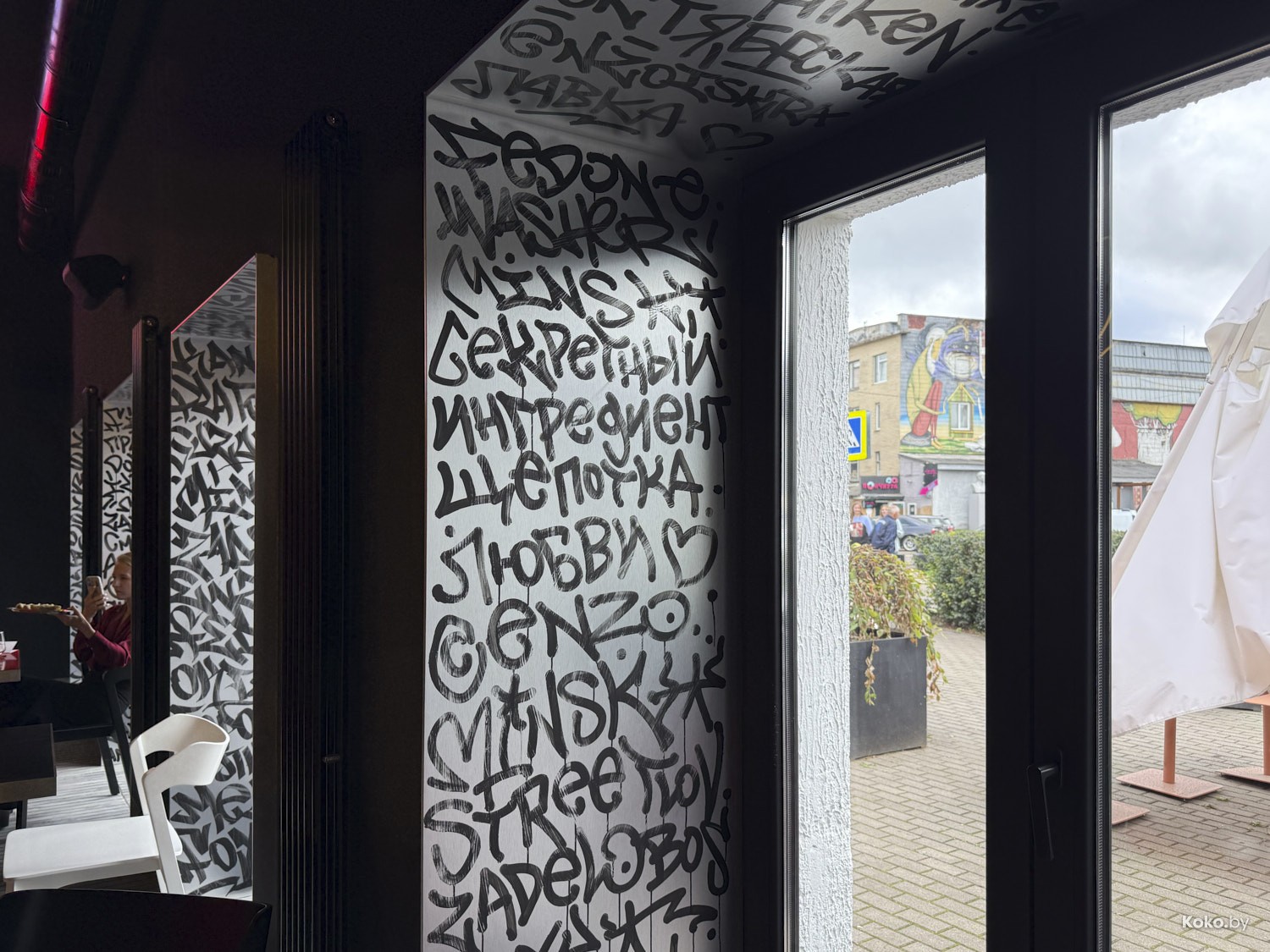 Модно, пёстро, молодёжно, расписанные баллончиками стены, пластиковые кресла с футбольной трибуны прикручены к доскам.