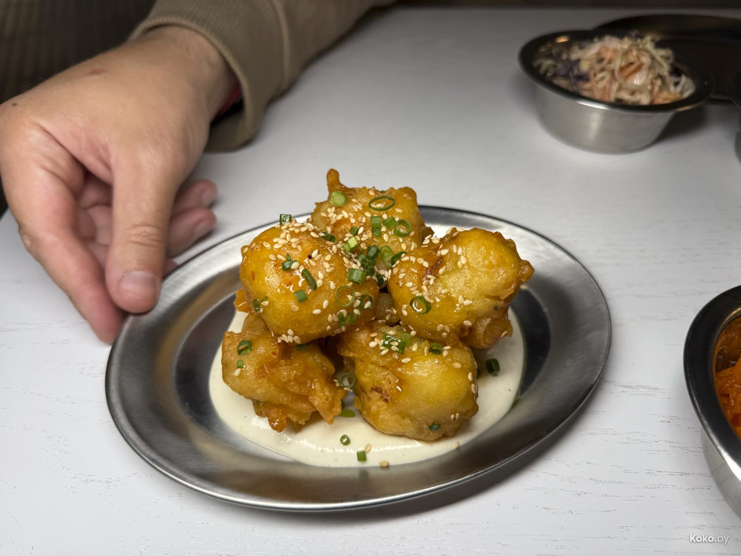 1. По наставлению персонала с открытой кухни дропнул цветную капусту фри в пышной панировке в кунжуте с луком на взбитом кремовом соусе с мазиком. Просто, вкусно, с вас 15р и ждём вас ещё.