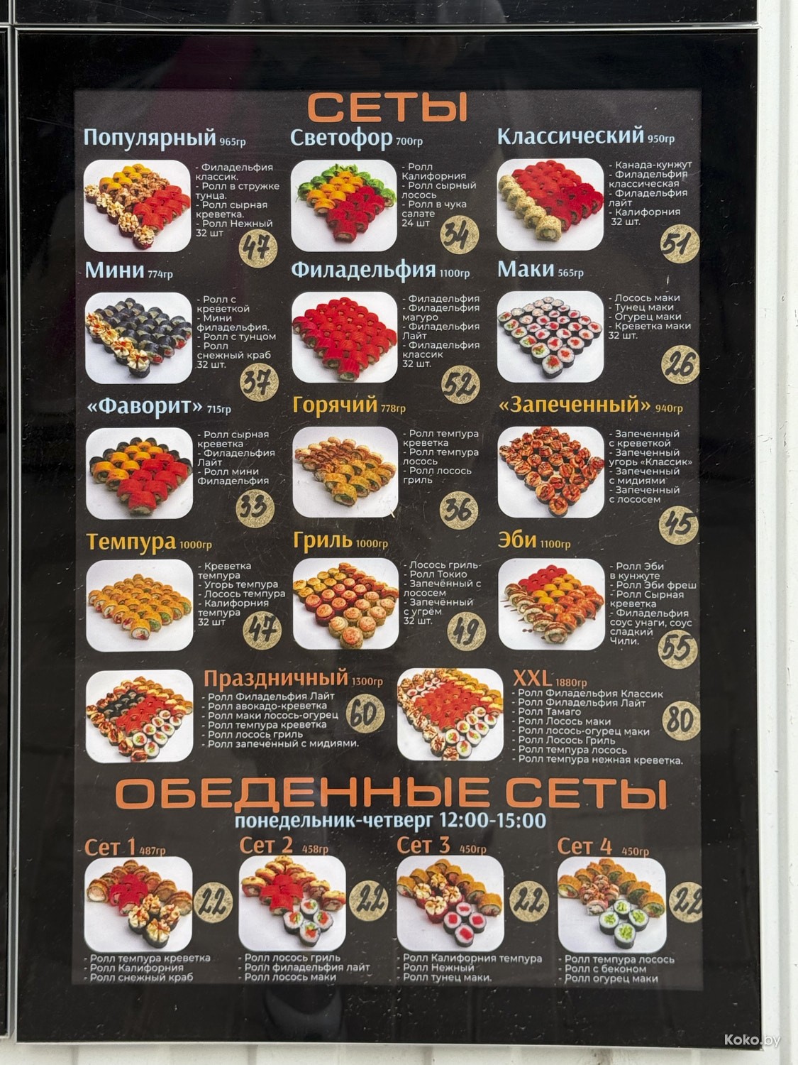 Суши крутят в киоске через дорогу от легендарного завода фотоаппаратов Зенит. На вопрос: «Какой сет самый популярный?!», из окна получил утвердительно: «Праздничный за 60р - много!».