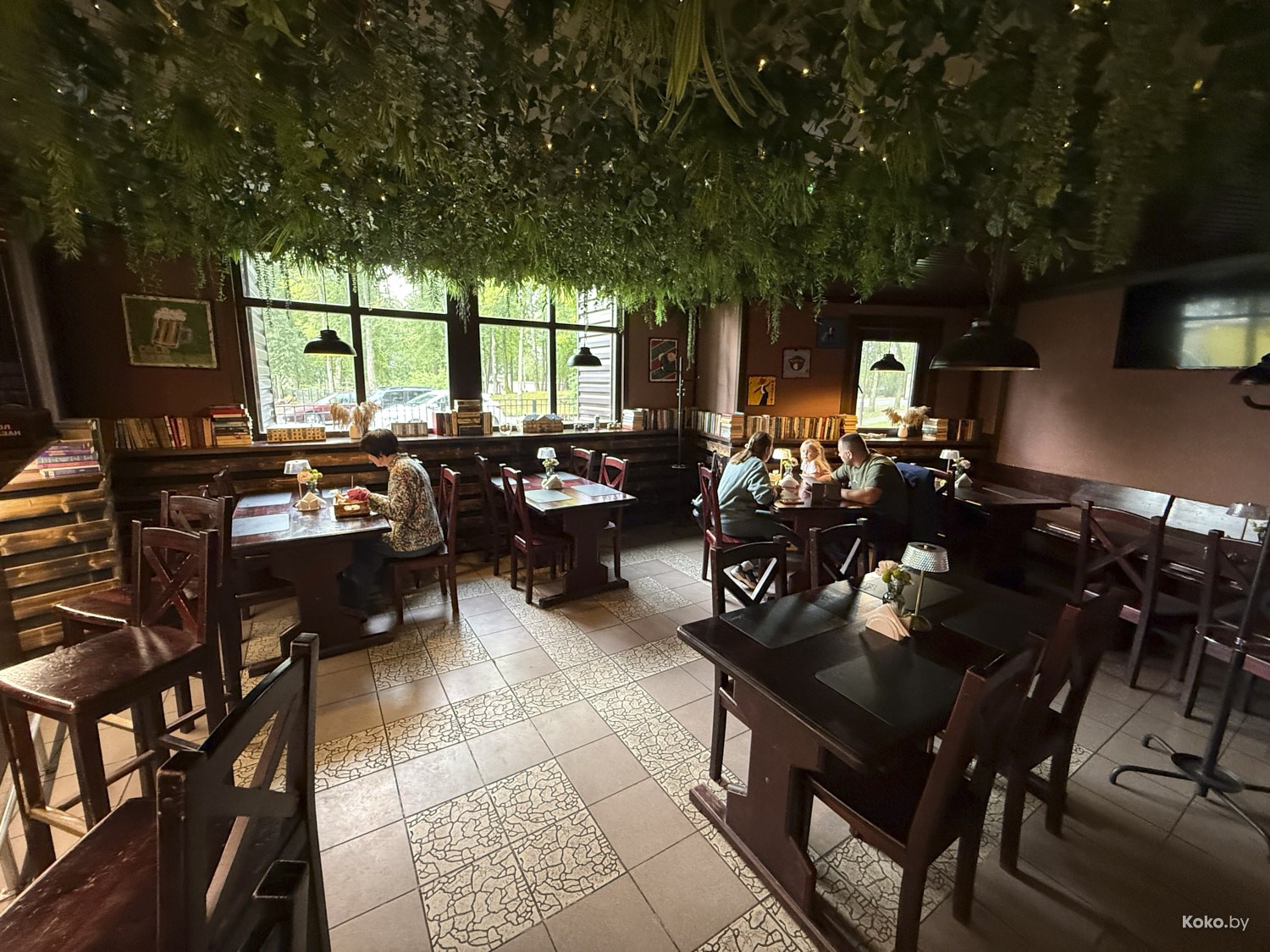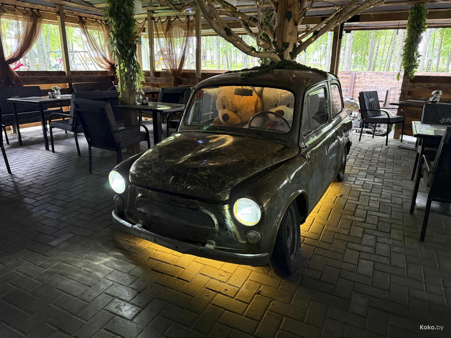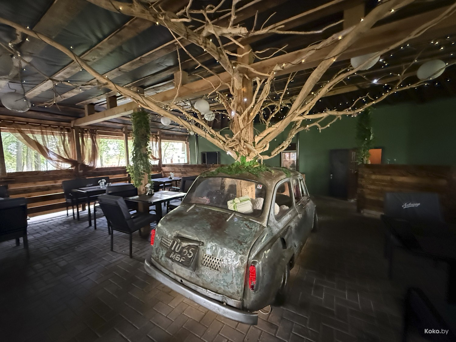 С дороги паб выглядит, как билет в травматологию: среди деревьев кирпичная хижина окружена деревянным забором, на летке памятником стоит машина, из которой растёт дерево. Терраса по атмосфере напоминает места из фильмов, где сжигают ведьм.