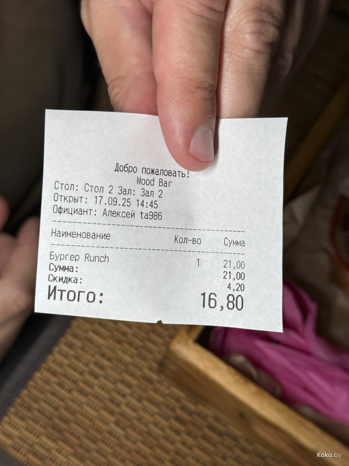 Тут подороже будет, заказываем фирменный бургер с двойной котлетой и гарниром за 21р, с обеденной скидкой получается 16,80р, вообще кайф.