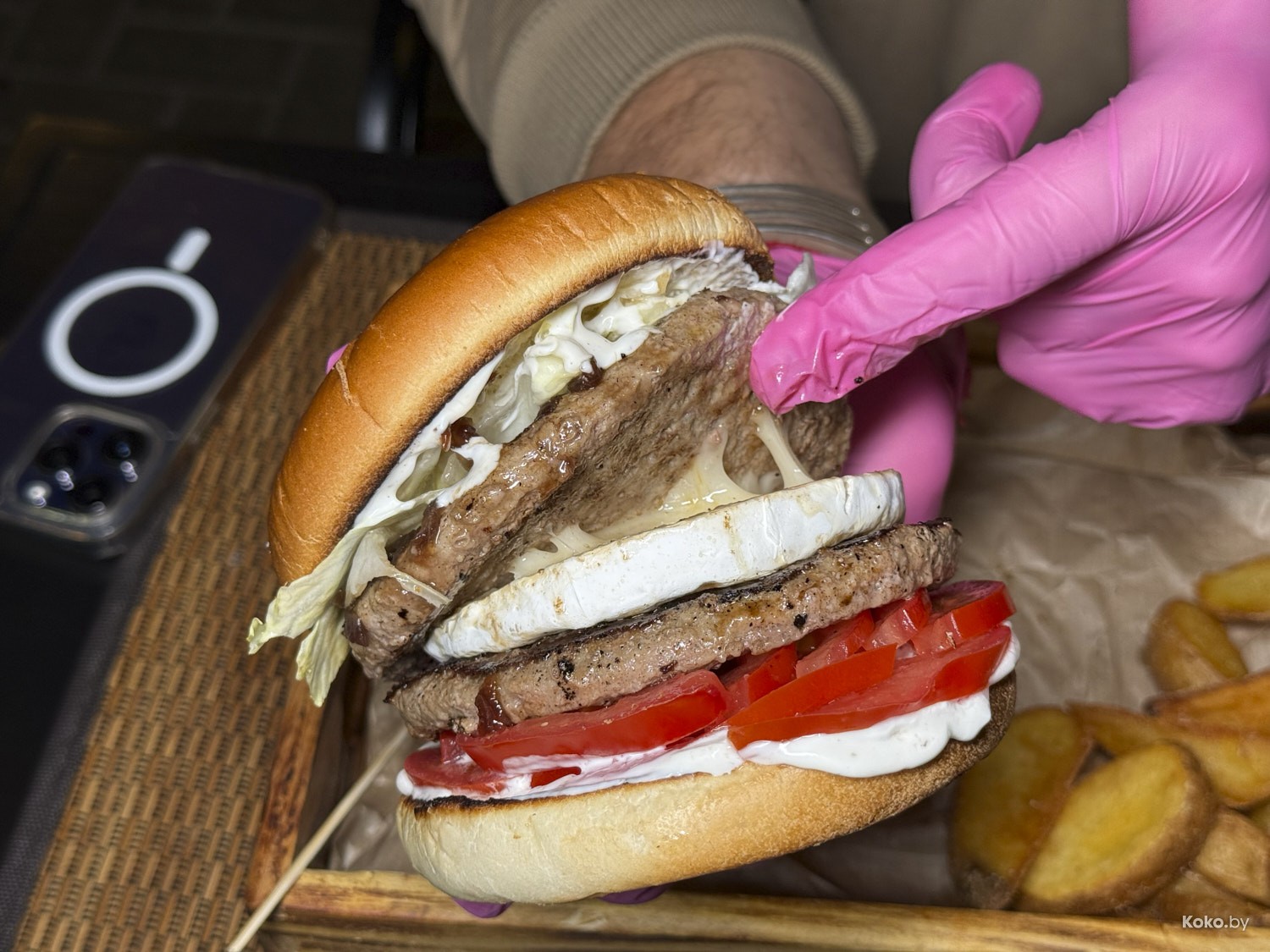 Вынесли его в полке с картошкой по-деревенски и розовыми перчатками. Булка пышная, под ней две мясные шайбы, душистый белорусский Камамбер, сладкий помидор, джем из лука и мазик.