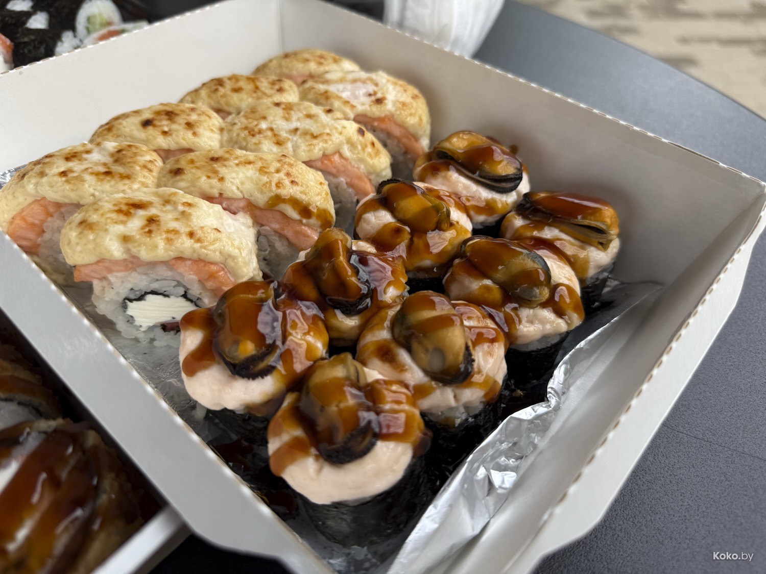 Остальное с лососем, авокадо, креветкой и мидией на мазике - хорошо, нужно поработать над заправкой риса Мицуканом.
