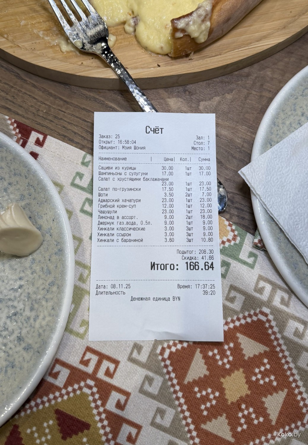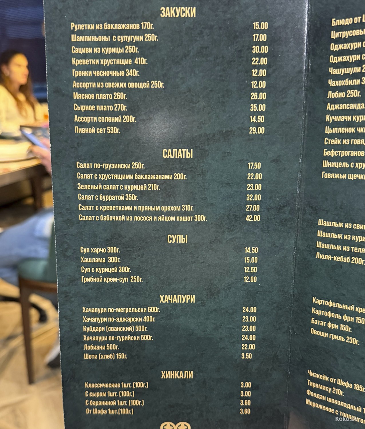 Тезисами и по делу: на языке прям, как в домашних кафе Грузии, только дешевле. Если соберётесь проверять обзор, берите хинкали, Сациви, ну шо ти, хачапури по-аджарски, Чашушули и чачу не запивайте вином!