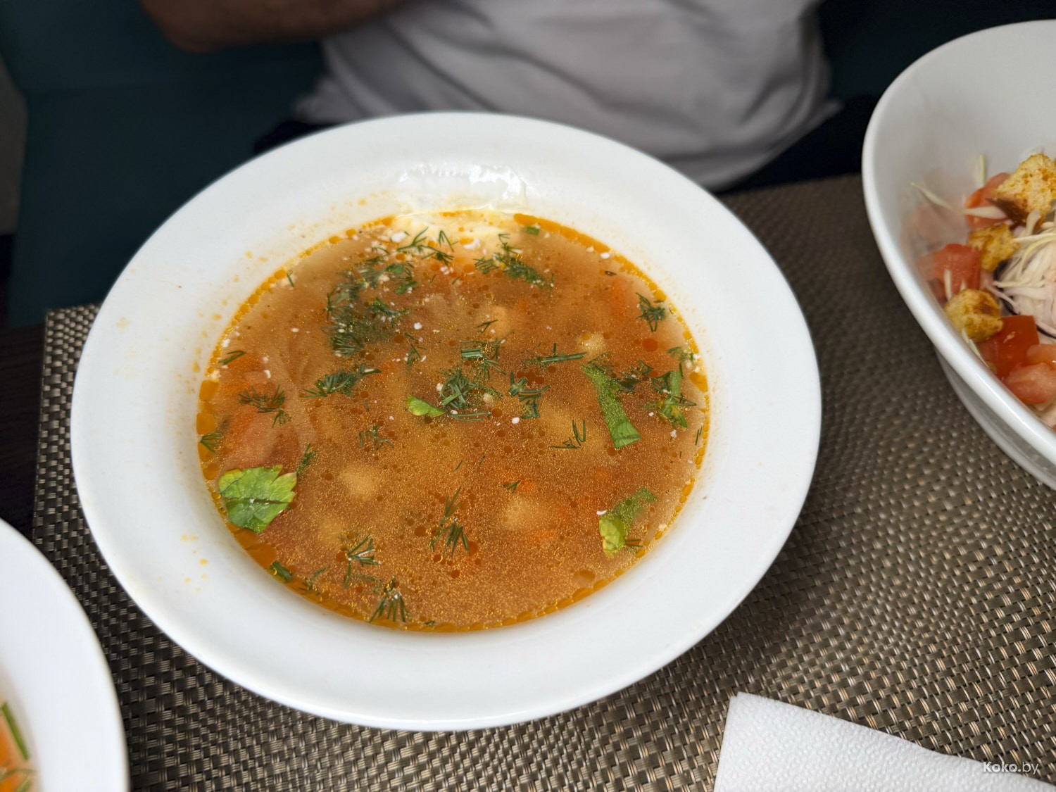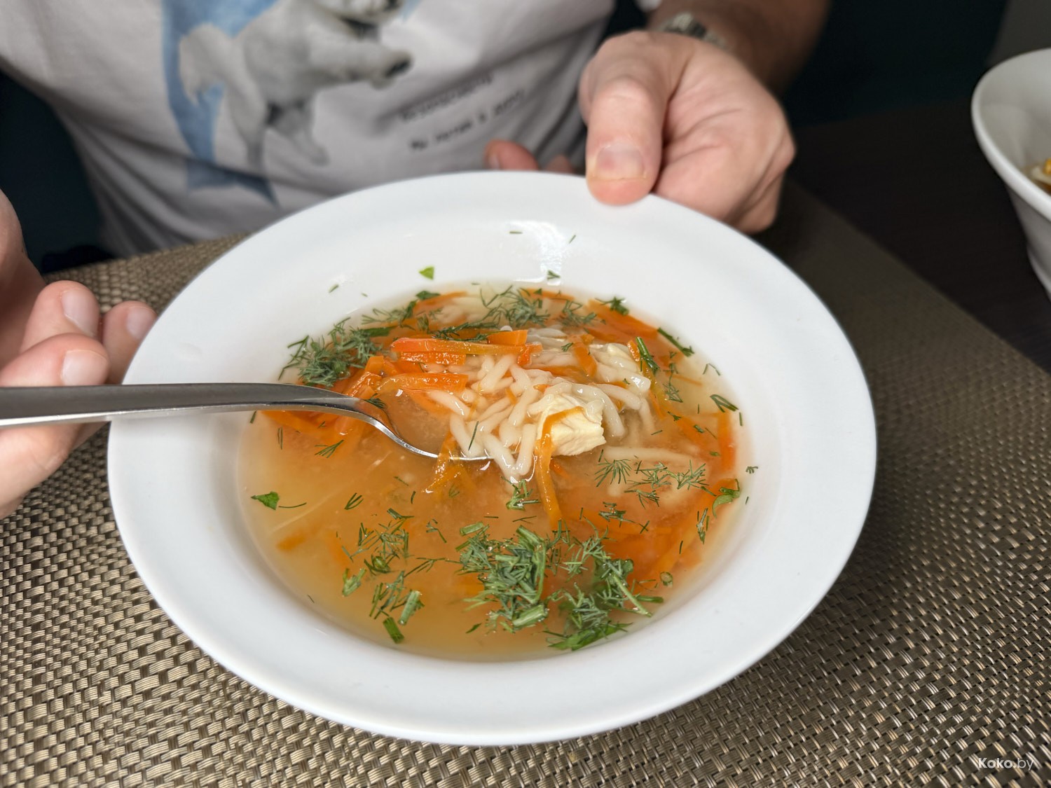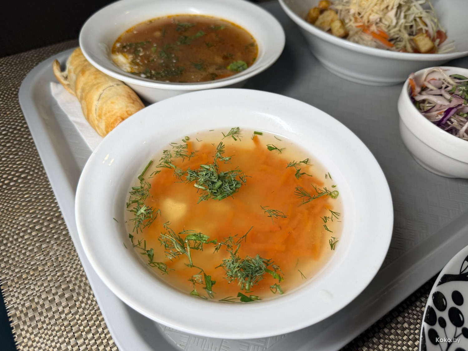 1. По супам, как дома: лёгкий самоварный бульон, овощи, чайная ложка мяса, стандартная порция в чайной кружке с ручками.