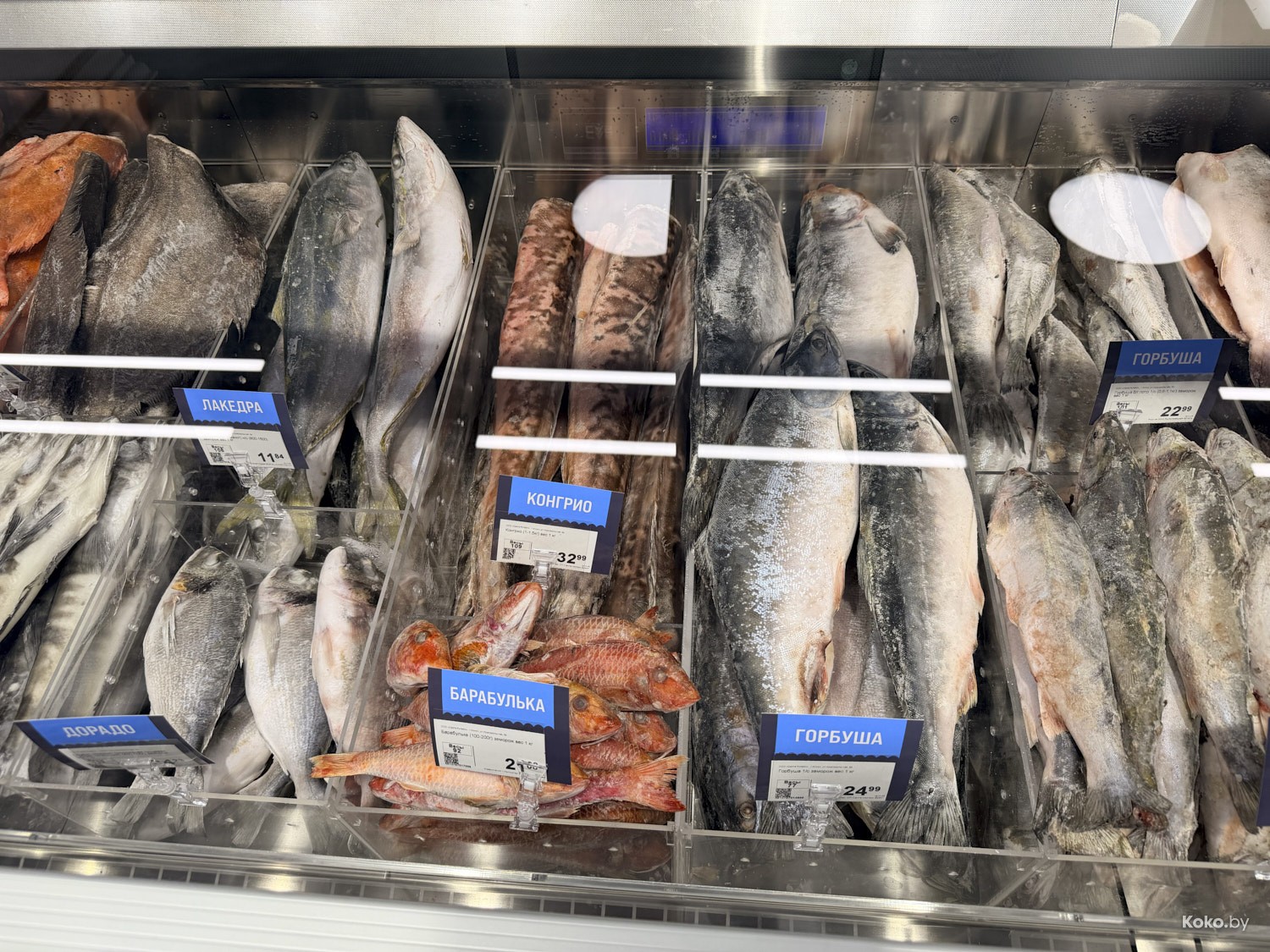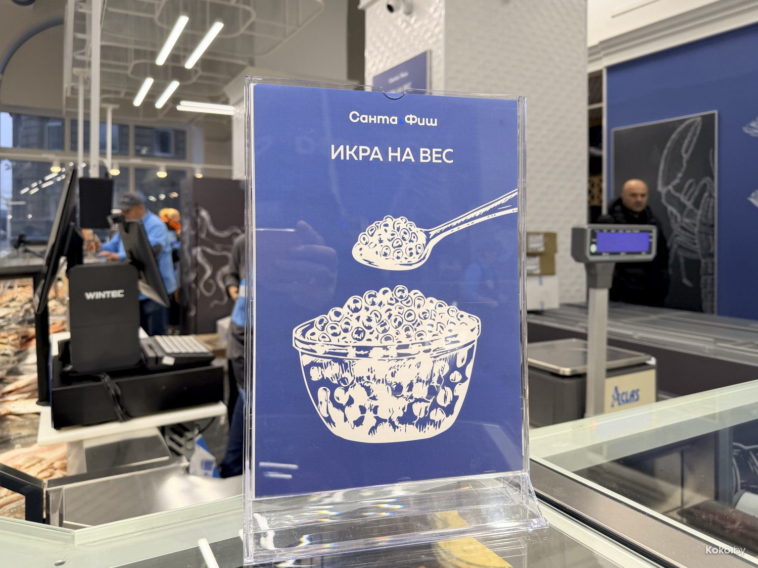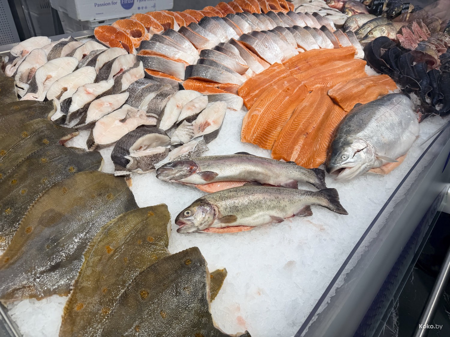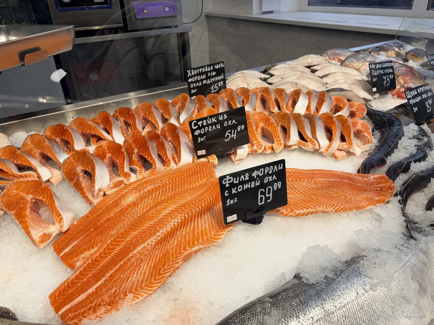 Открытие после глобального тотального ремонта началось с очередей, как бабушки узнают об открытии раньше меня - ума не приложу. Одна на весь Минск рыбная лавка «Санта фиш» от «Санта Бремор» находится на углу улиц Комсомольской и Карла Маркса. И это единственный магазин, специализирующийся на рыбе и мориках: заморозка, охлаждёнка, филе, стейки, тушки, маринованный лосось, икра чёрная, икра красная и рыба разных форм и копчений.