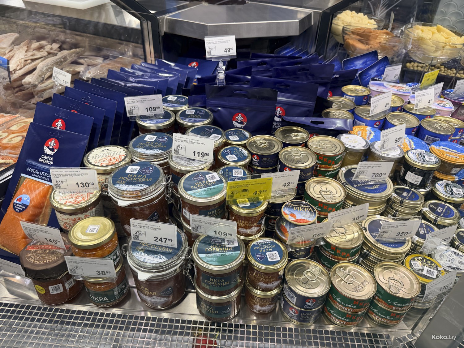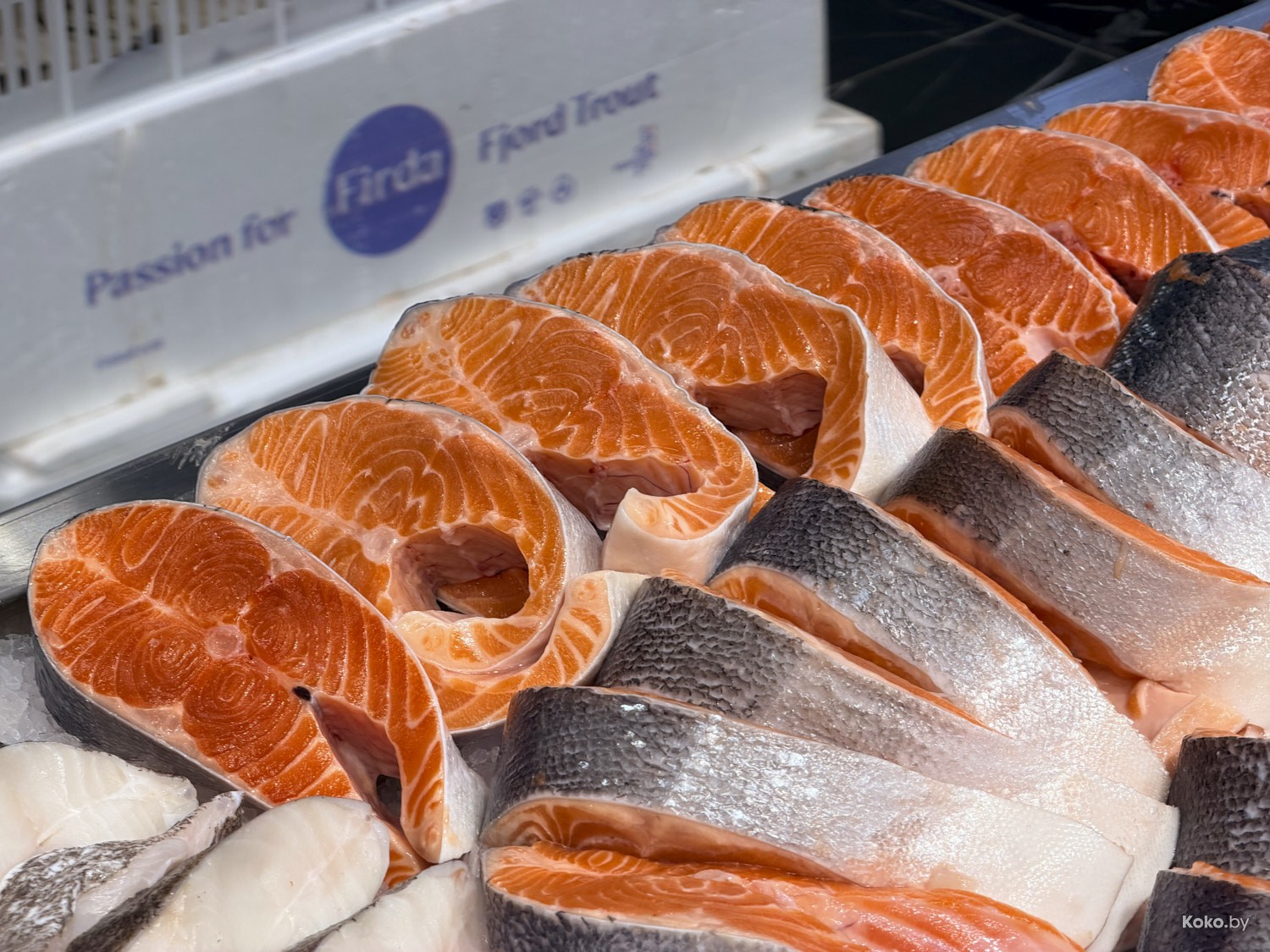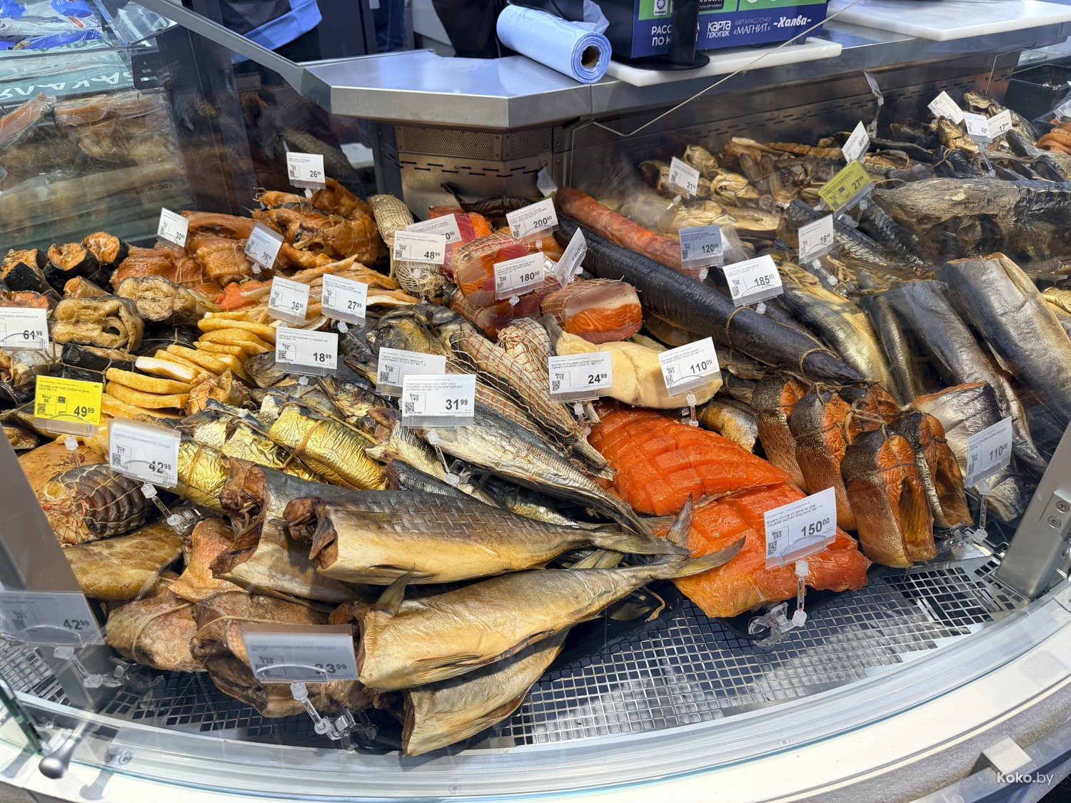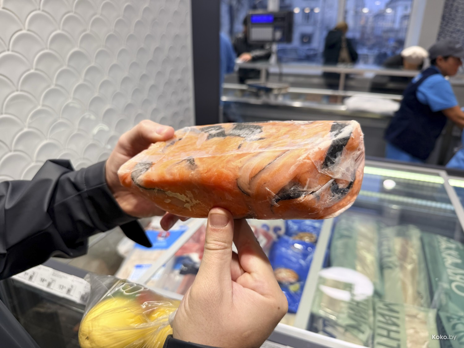 Открытие после глобального тотального ремонта началось с очередей, как бабушки узнают об открытии раньше меня - ума не приложу. Одна на весь Минск рыбная лавка «Санта фиш» от «Санта Бремор» находится на углу улиц Комсомольской и Карла Маркса. И это единственный магазин, специализирующийся на рыбе и мориках: заморозка, охлаждёнка, филе, стейки, тушки, маринованный лосось, икра чёрная, икра красная и рыба разных форм и копчений.