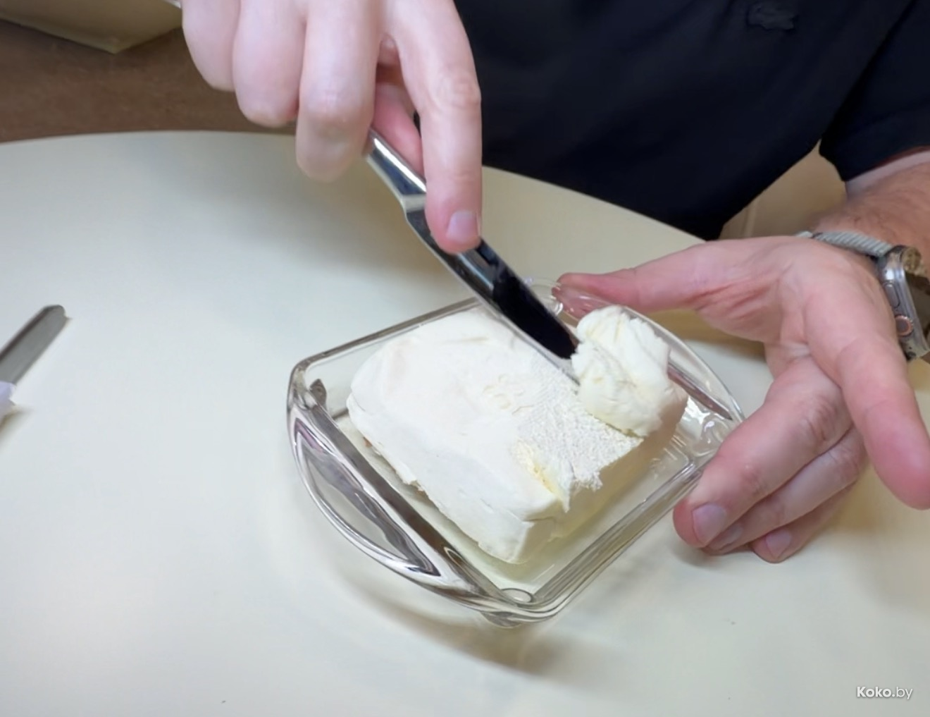 2. Мокрый медовик за 16р замаскировали под кусок сливочного масла в маслёнке. Никакого удовольствия от десерта, но выглядит, как живой.