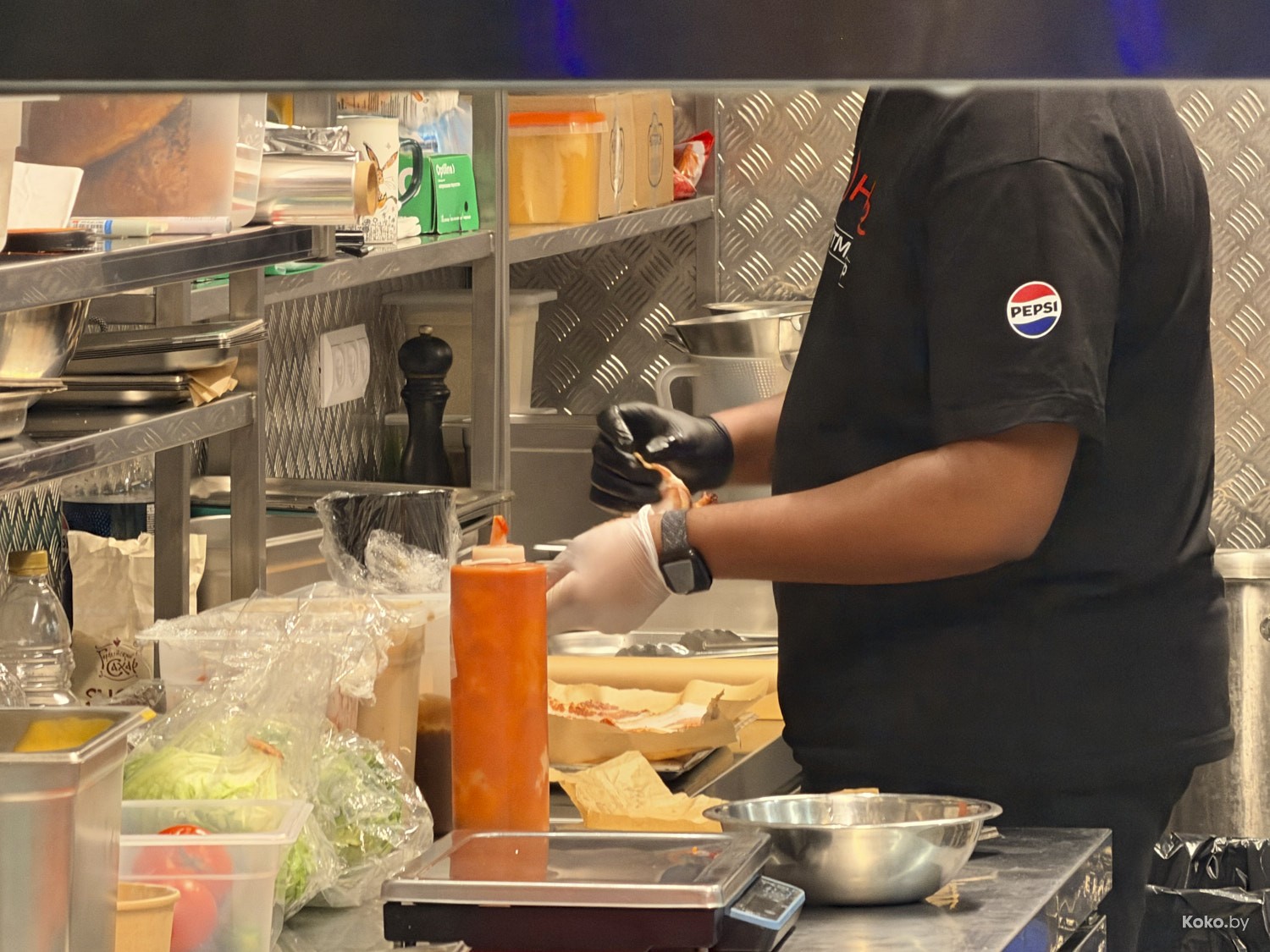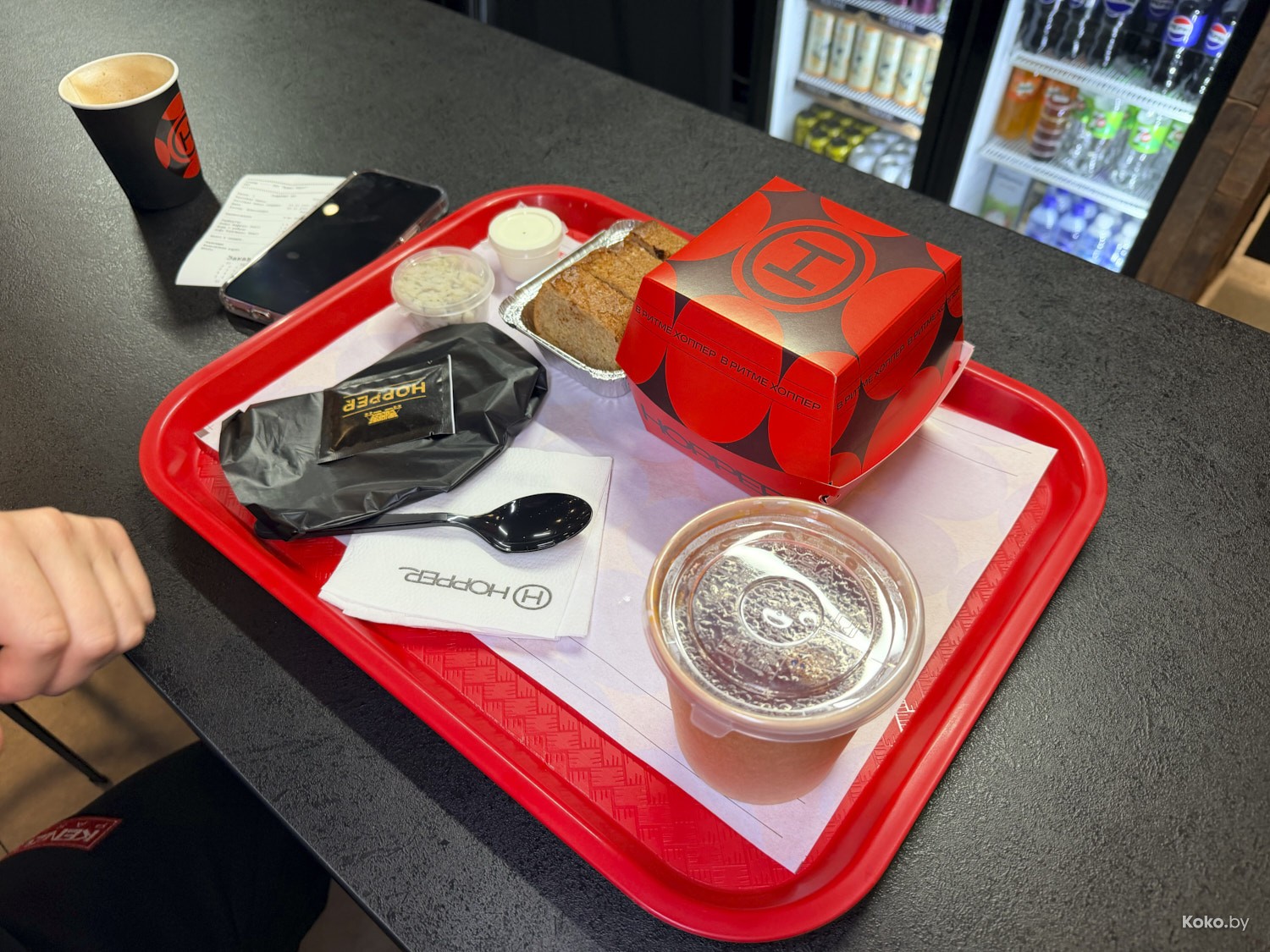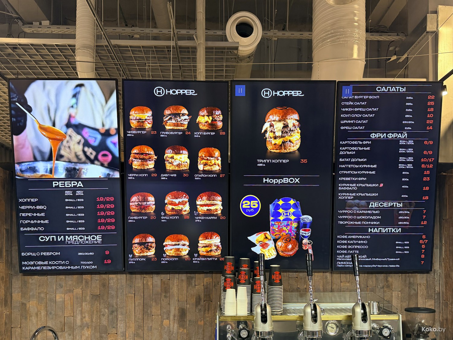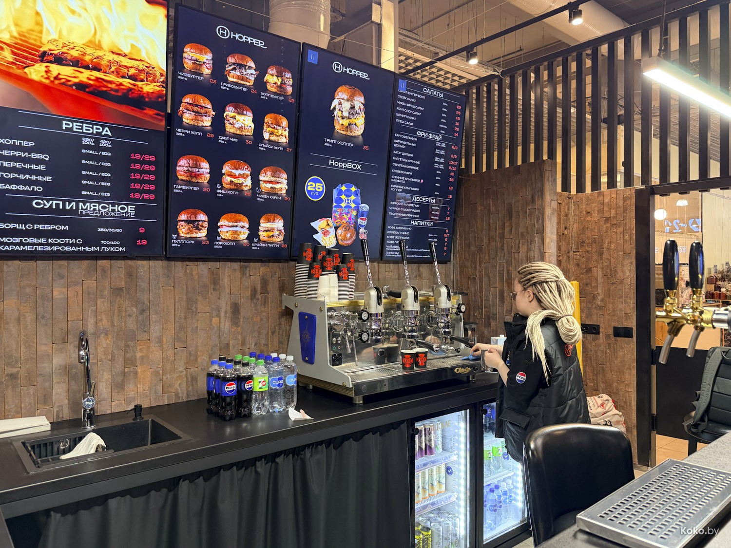 Собирают бургеры от 20 до 35р за тройную котлету, тот самый борщ с ребром за 9р, рёбра по 19р детская порция и капуч варят для местных.