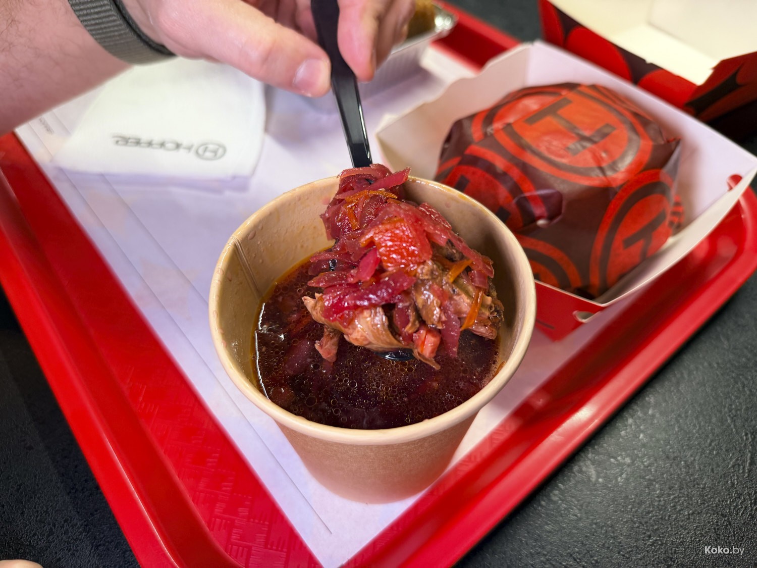 1. Наваристый, как у мамы борщ, с мясом без ребра, своим хлебом и смальцем за 9р на 8 кокобаев. Из минусов всё в картоне, без посуды.