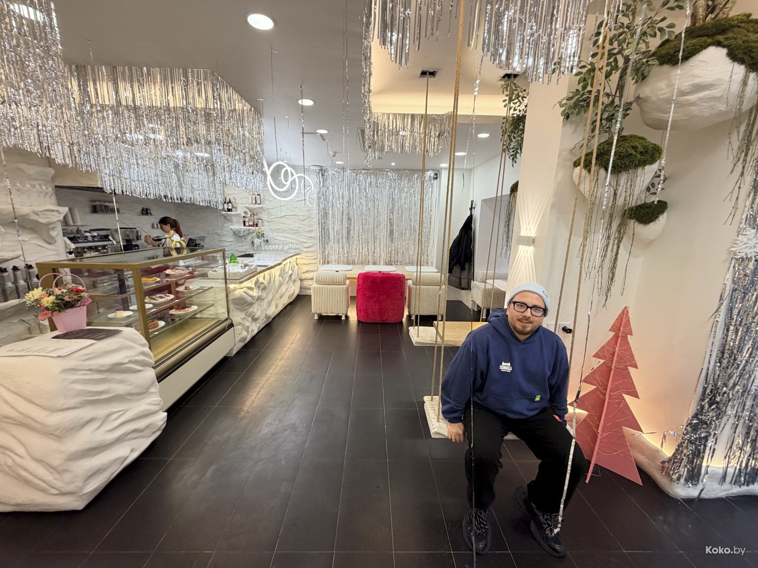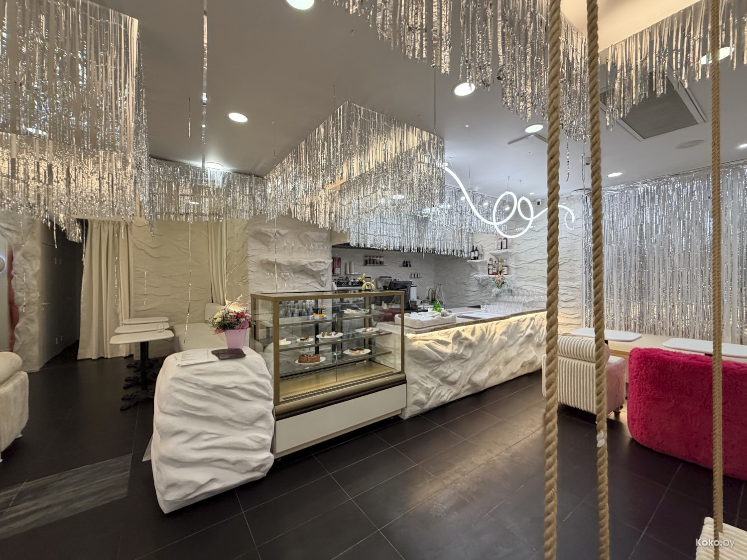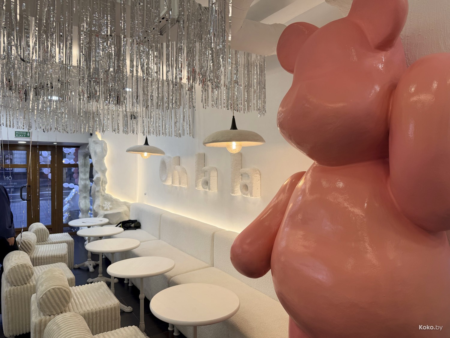 Как в детской комнате, чуть паничку не словил от обилия мишуры. Стулья, обтянутые искусственным барашком, зеркала, розовое кресло, качели, и розовый медведь поставлен в угол, возможно провинился.