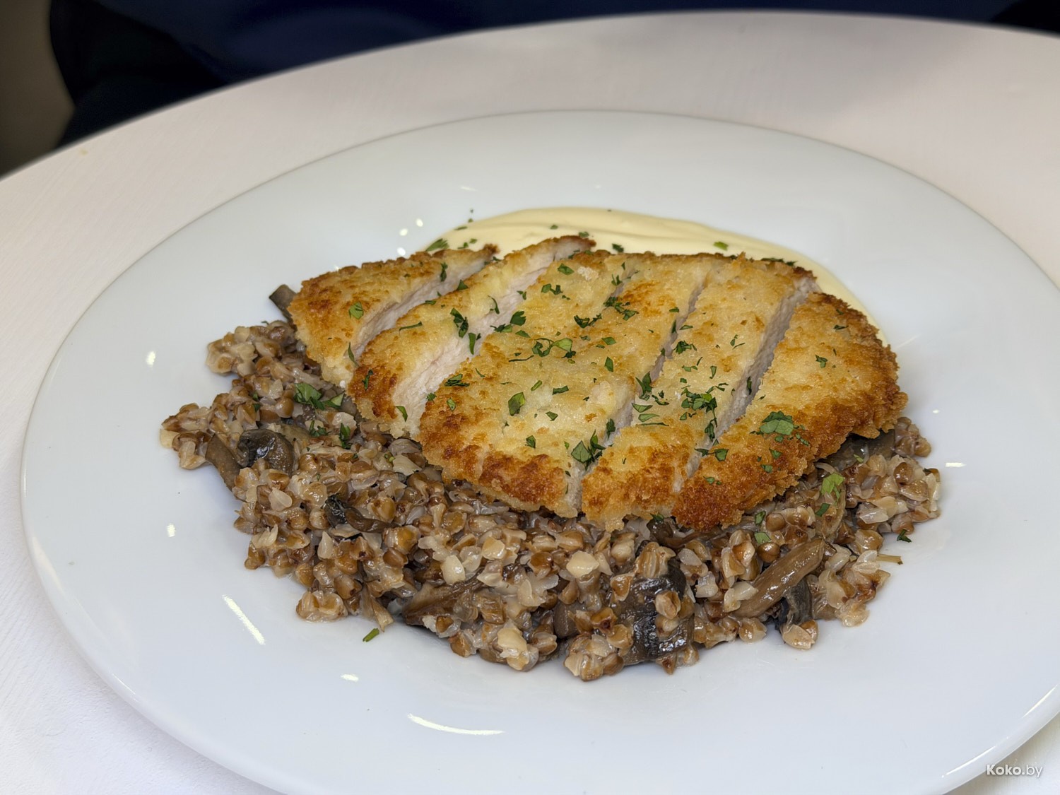 2. На гречневую кашу выложили порубленный куриный шницель, посыпали петрушки и подлили сырный мусс, подача, как в столовой.