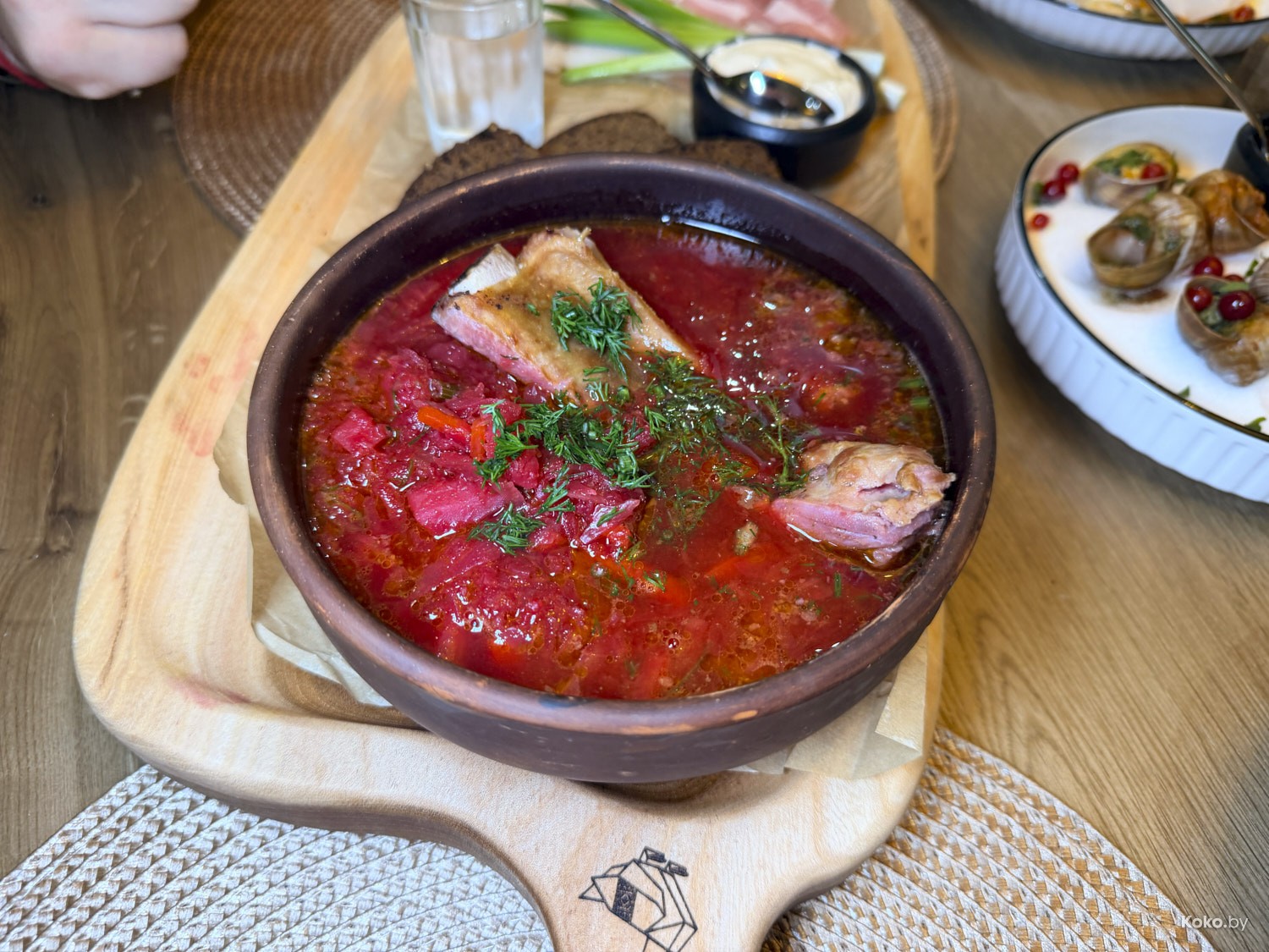 2. За 17р много борща с мясным ребром, салом и шотиком беленькой. Нежирный, сбалансированный сахаром, порция на двоих. Берите гусиный борщ смело под любой повод и напитки, за водку не скажу.