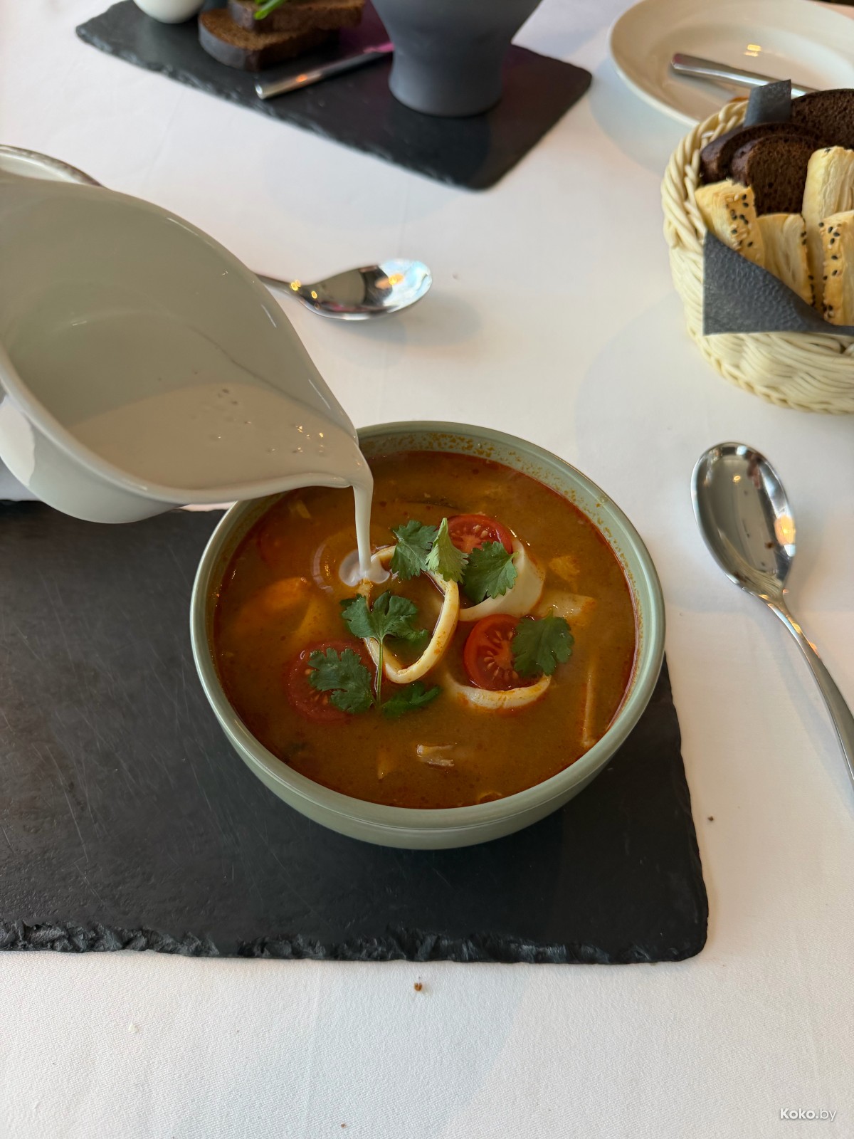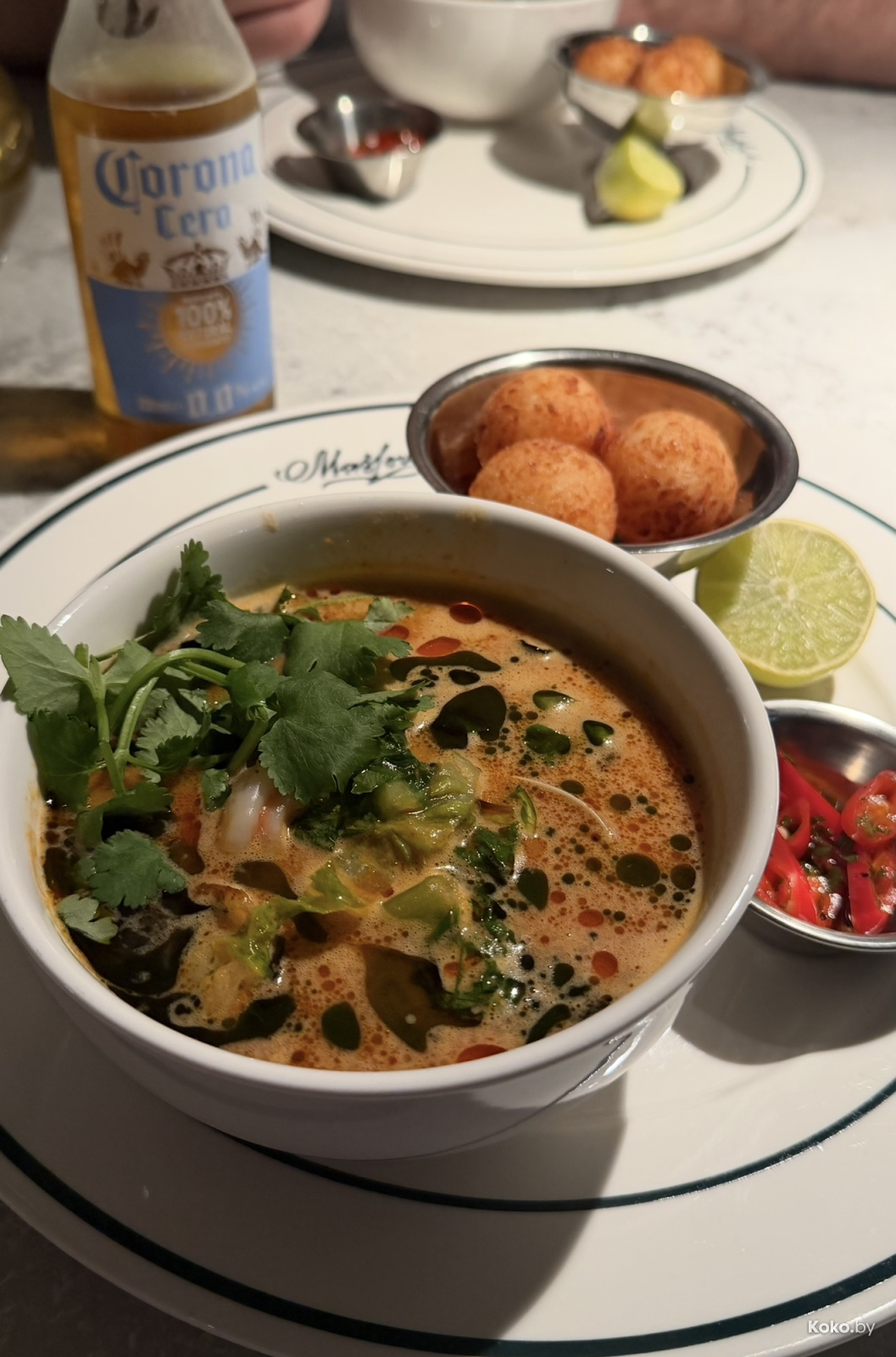 4. В миске кипящего Том Яма за 22р утонула яркость галангала и кафир лайма, не пряный, не пахнет Тайландом, но суп смачный и честный.