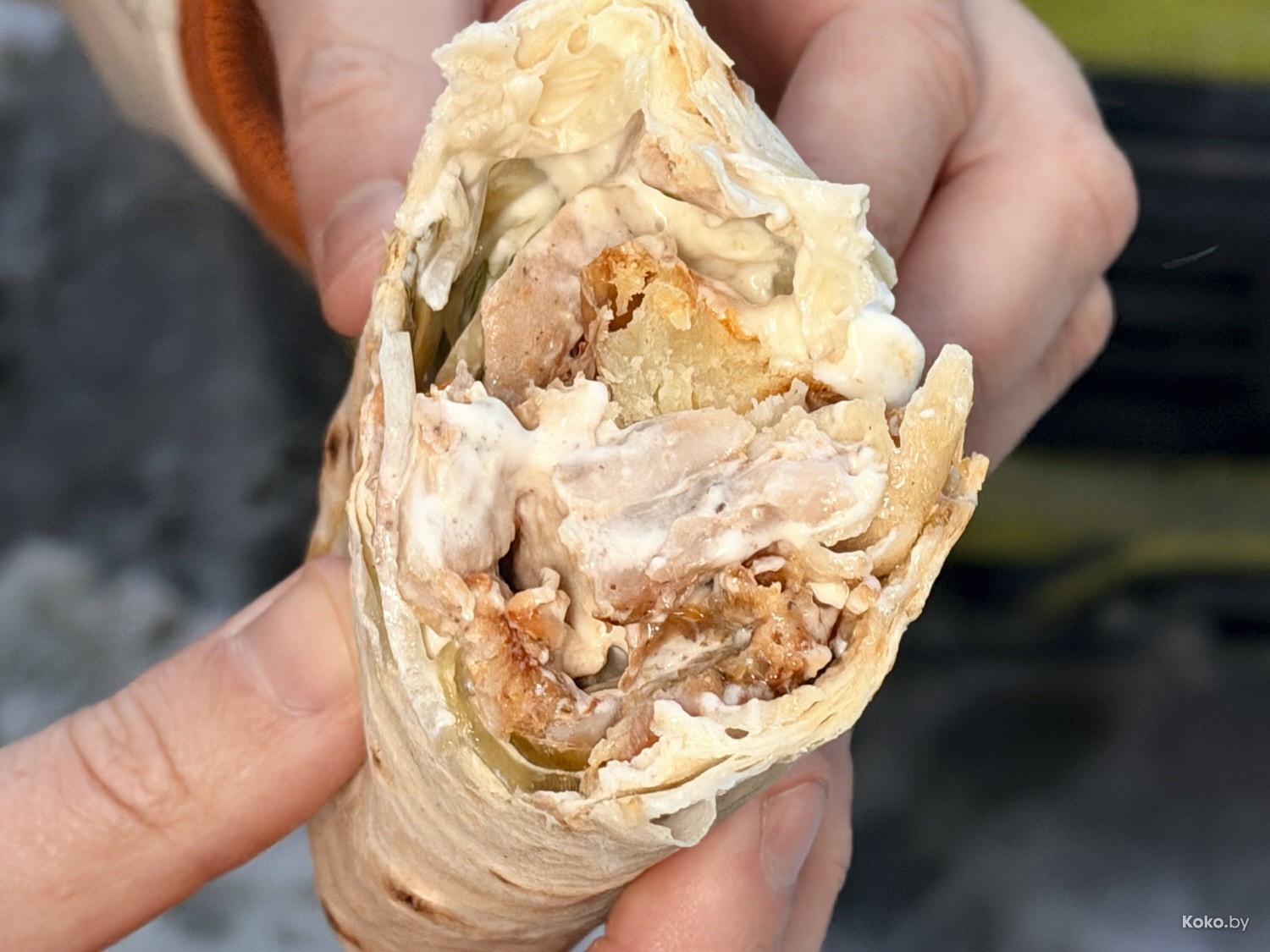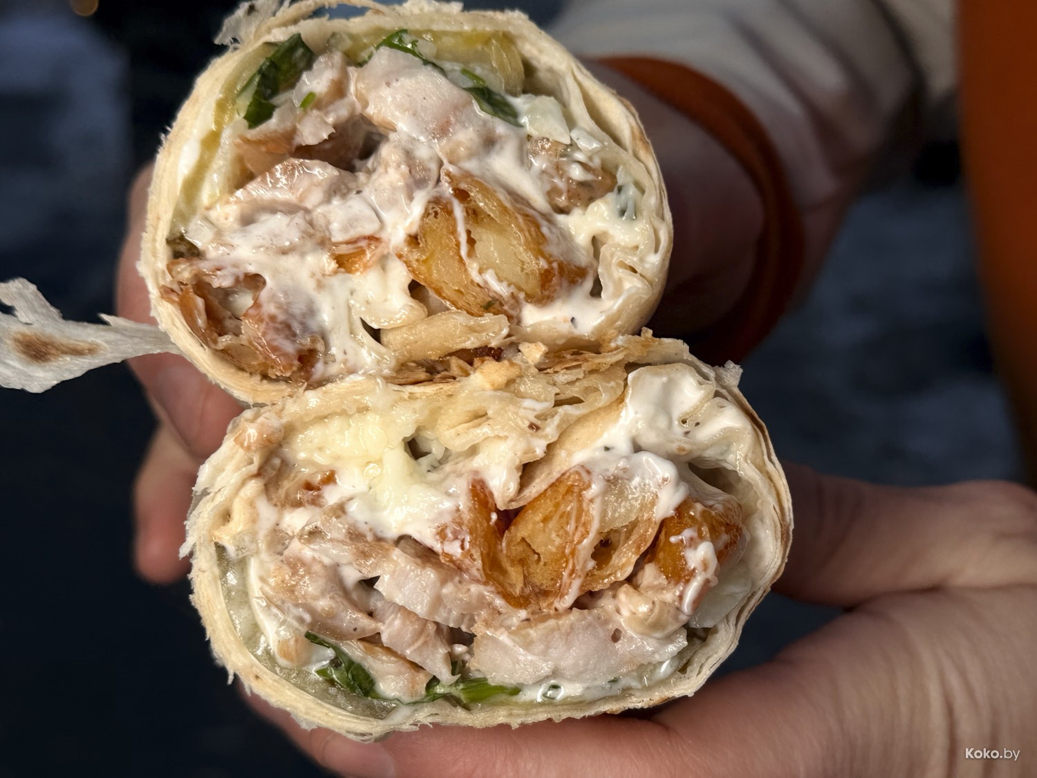 1. Шаурма увесистая, грамотно скручена, внутри сочная курица, красный лук, жареный картофель под густо залитыми майонезными соусами.