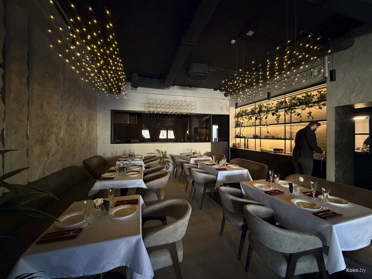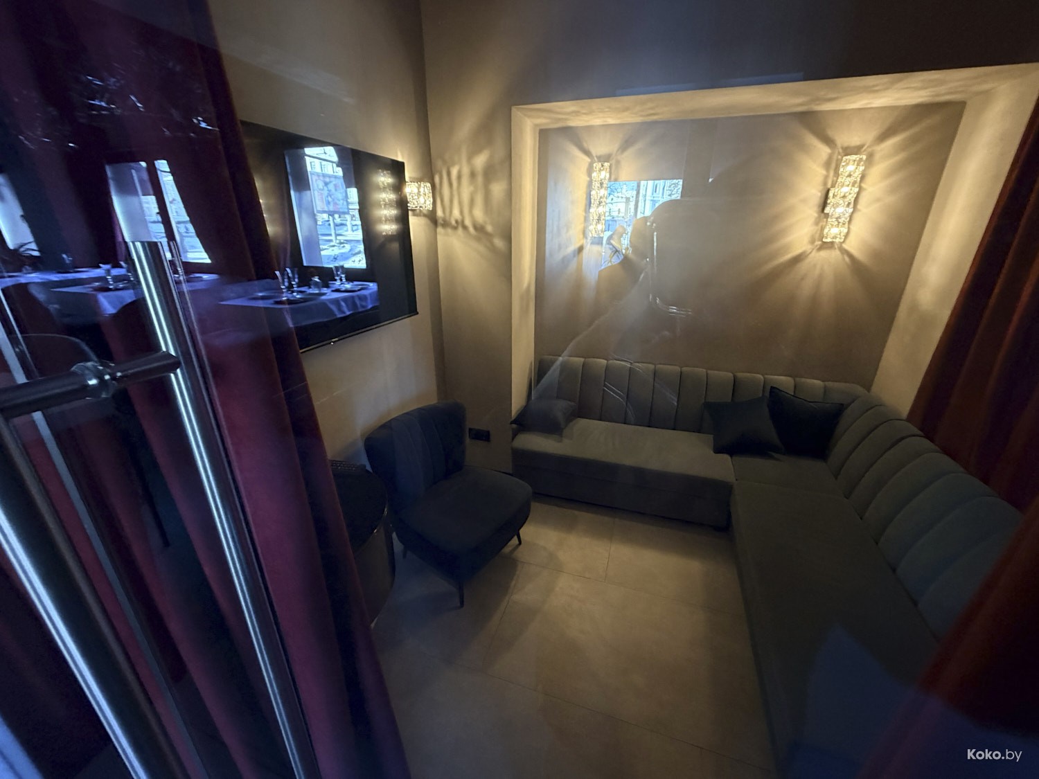 Барная стойка та же, лампы те же, накинули в пол плотные бордовые шторы, закупили посуду, ликвидировали аквариум с устрицами.