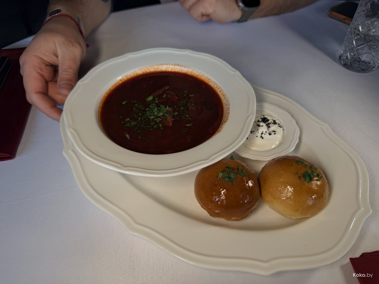 1. Стандартная тарелка мясного борща со сметаной и булочками за 16р.