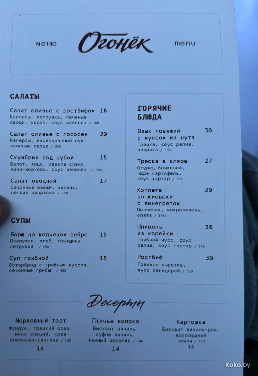 Нет покоя юным рестораторам и уставшему от опытов помещению на площади Свободы, 17, где из всех проектов реально годным была итальяшка «Густо Джусто», где готовили шикарную пиццу Кватро формаджи. Последними были «Изи бар» и паназиатский ресторан, который «Моджо», оба ручки сложили довольно-таки быстро, следующая станция «Огонёк». Никакой пиромании, лишь частичный ремонт и новая концепция современной советской кухни.