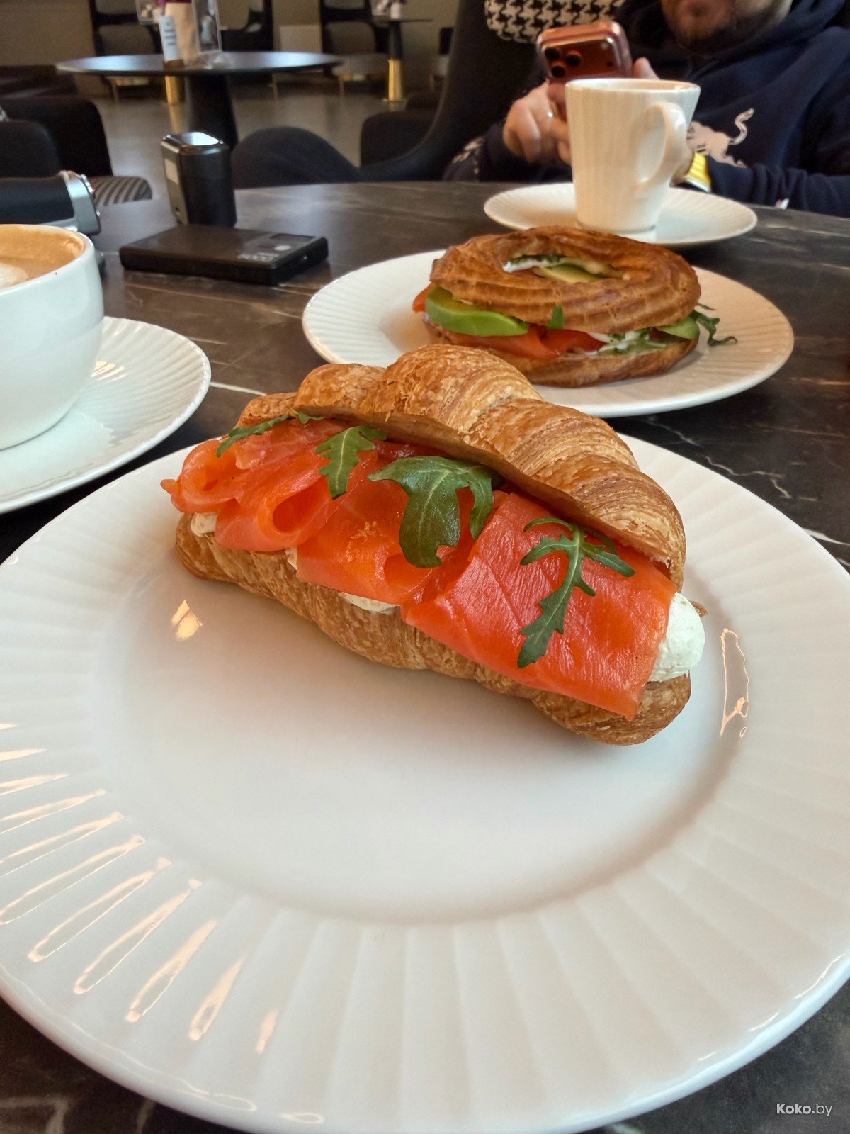 Ничего не ожидал, а тут вдруг пышный, жирненький круассан с честной порцией рыбы своей соли под каким-то соусом. Крепкие 9 кокобаев.