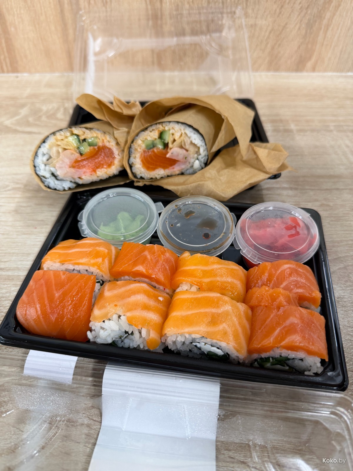 Батон, промазанный кремчизом, с честной порцией бодрой форели за 7,29р был съедобен, что не скажешь за роллы из коробки.