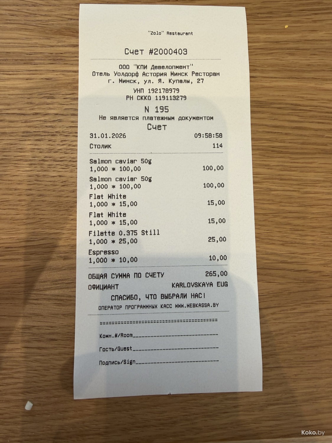 Зажав в кулачке 100р, проверяем, чем кормят в ресторане «Золо» с 06:30 до 10:30. Подземный паркинг только для жильцов, внутри ресторана дорогой, стилёвый интерьер, который своим вайбом переносит из Минска куда-то далеко, ради атмосферы можно вытерпеть многое.
