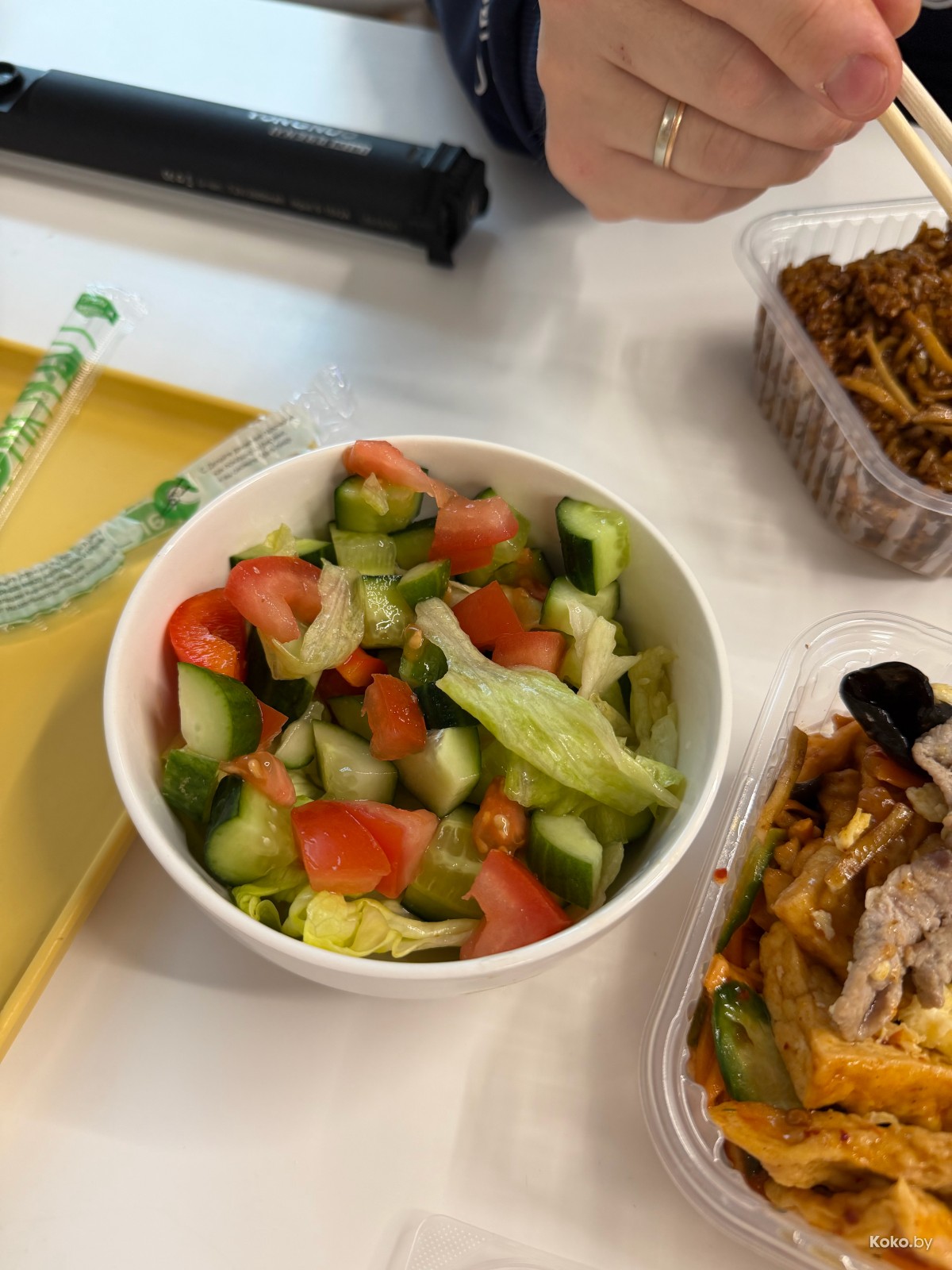 Наш обед - два контейнера с мясным миксом, тофу, лапшой и рисом по самую крышку за 20,80р или по 10,40р с человека, ну красота же! Дополнительно салат за 6р в «Панда рамен», там же и палочки.