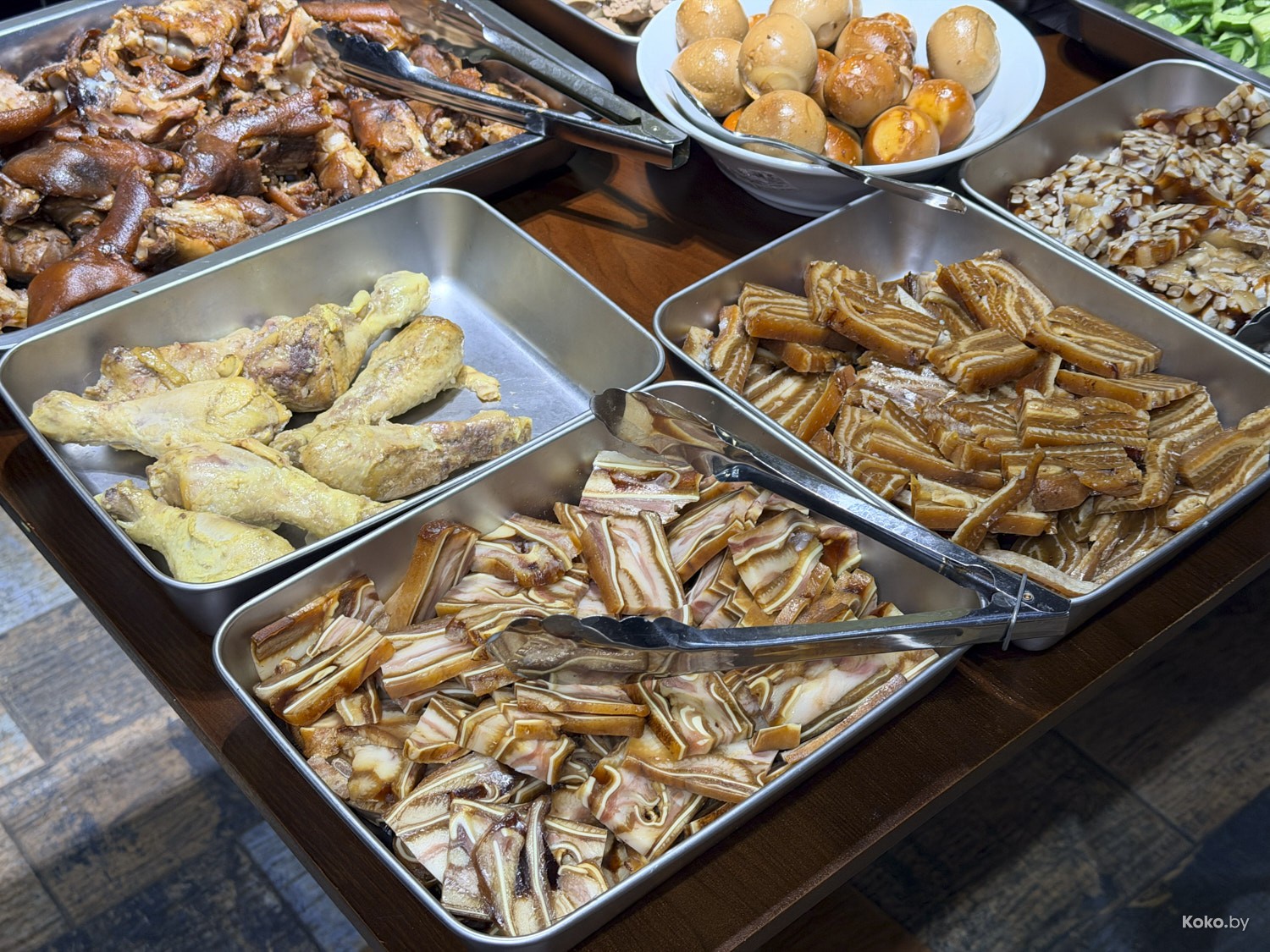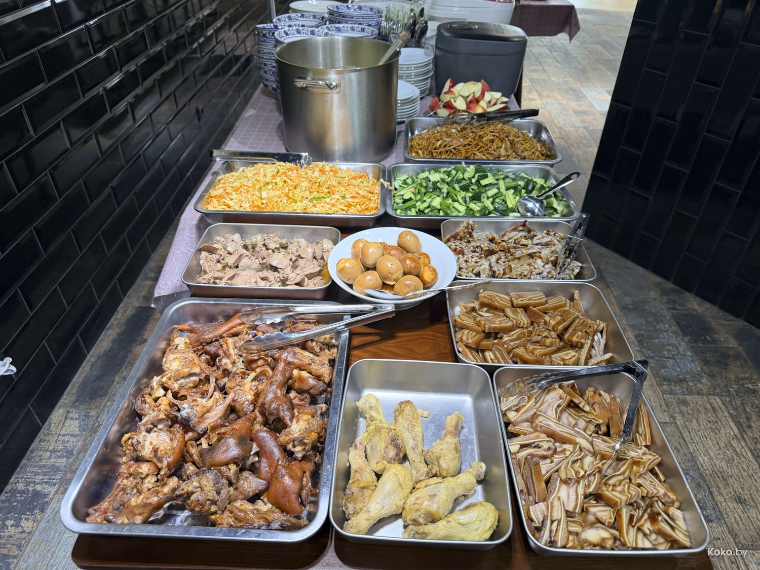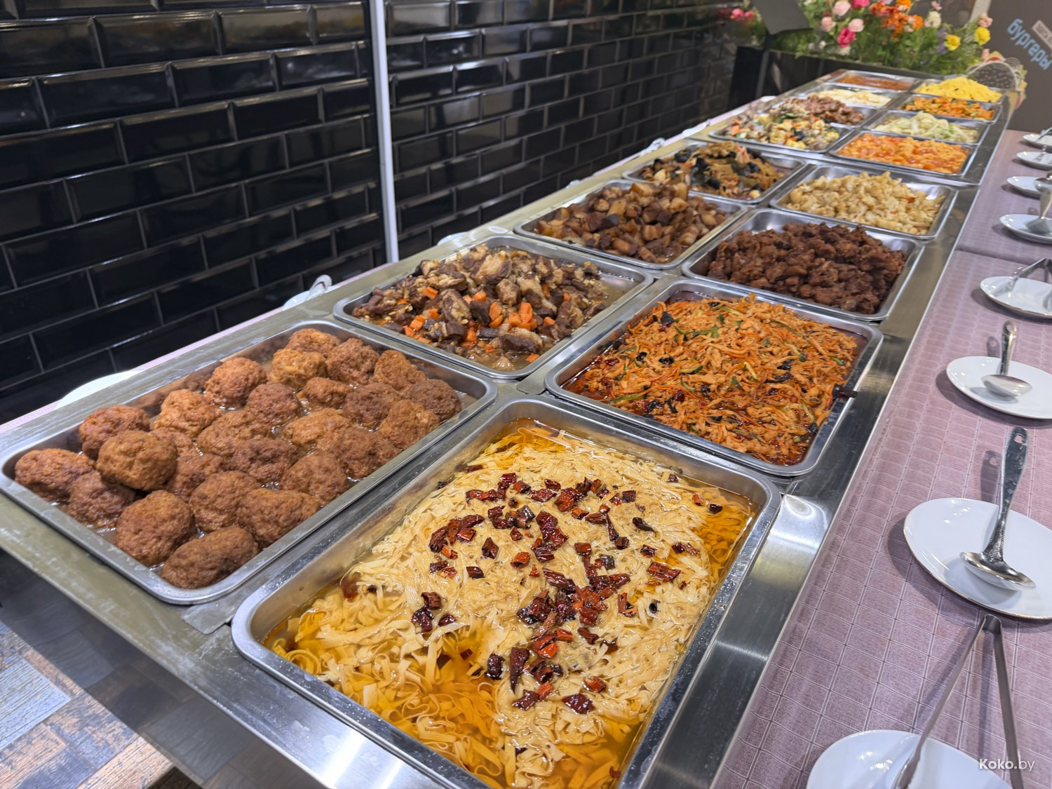 В «Арена Сити» за фудкортом есть такое домашнее китайское кафе, где запустили обеды по формату шведского стола без ограничений. Сегодня наготовили свинину в разных соусах, говядину с костями, рёбра поросёнка, жареный тофу, рулеты из ушей, омлет с помидорами. Вижу всяческие салаты, жареную лапшу, два вида риса и прочее китайское, что сложно идентифицировать на глаз. Всё это можно есть на месте, запивая супом за 18,80р с человека.