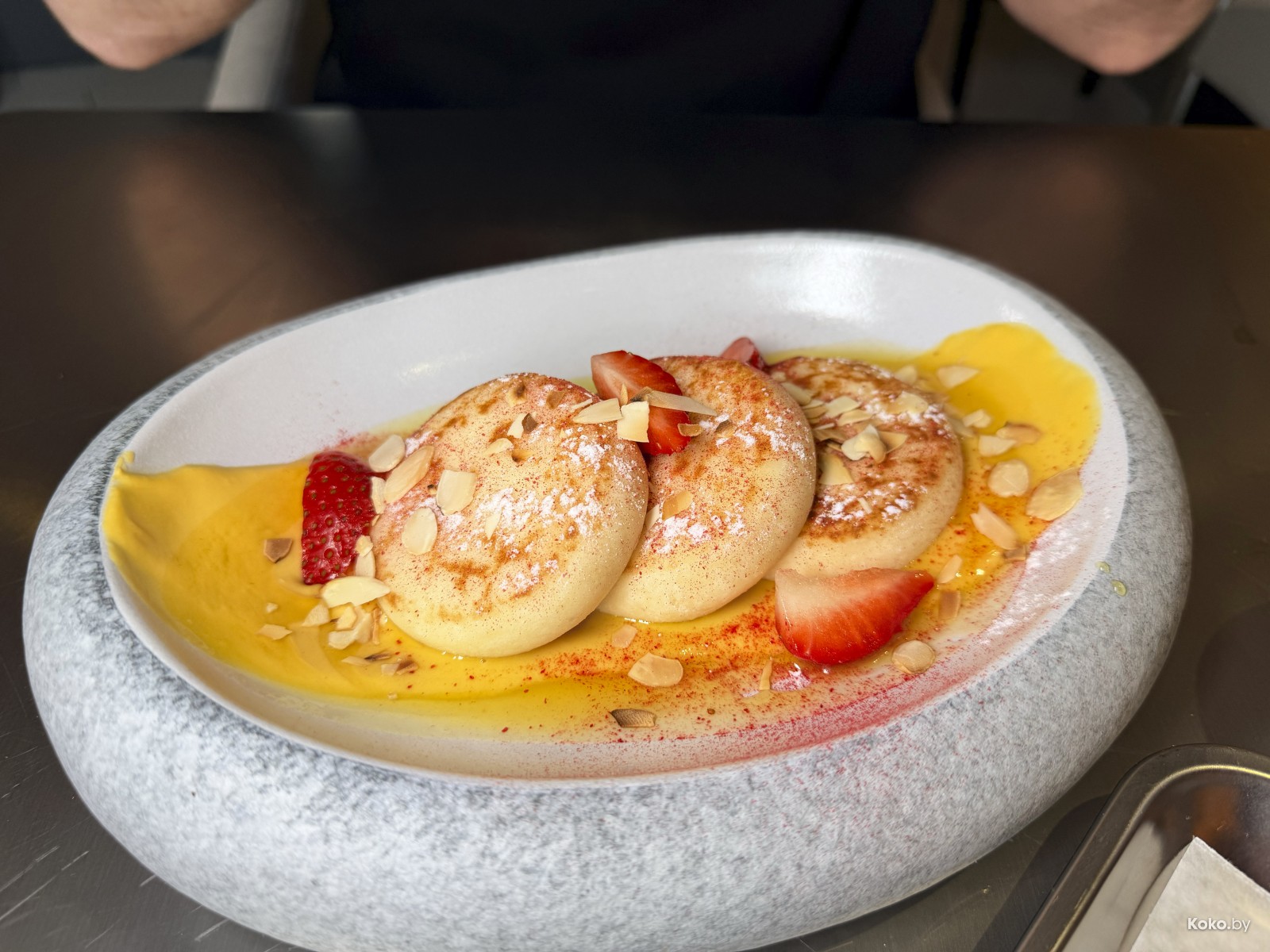 3. Три воздушных сырника размером с шайбу на соусе манго под миндальными чипсами за 18р, как в лучших маминых домах.