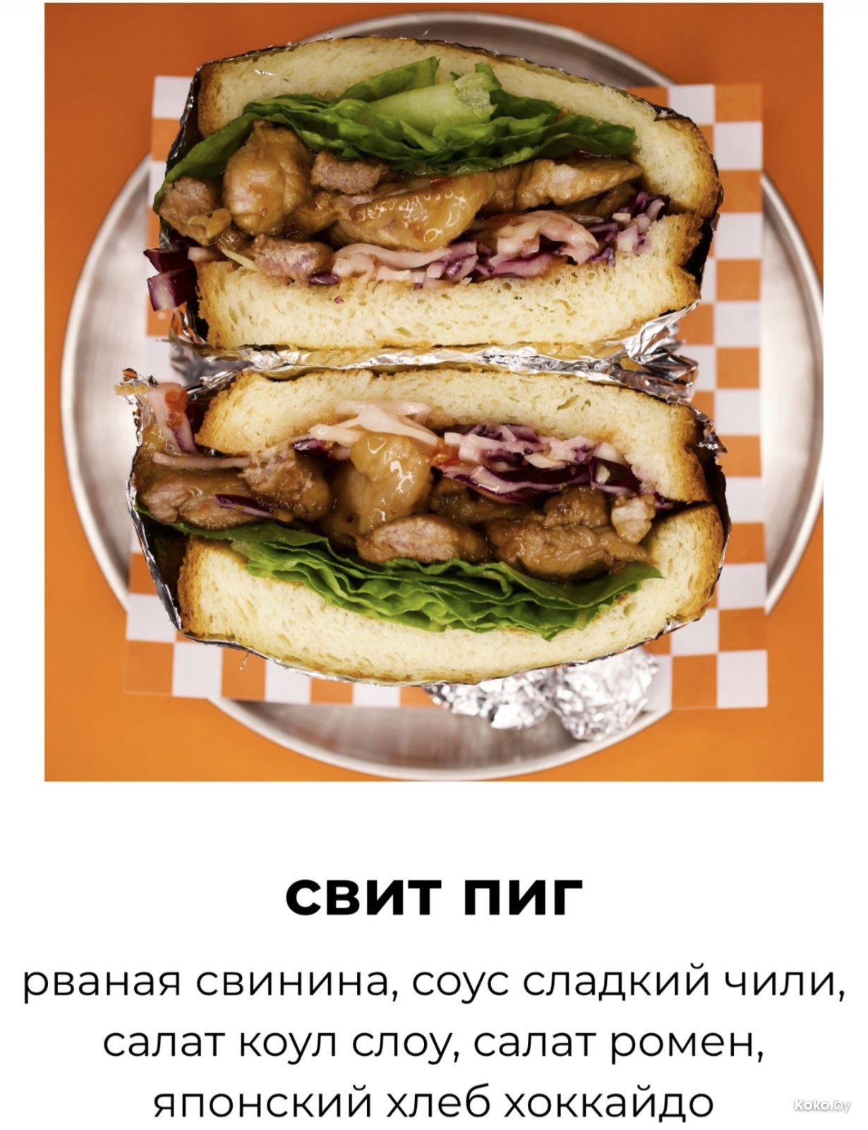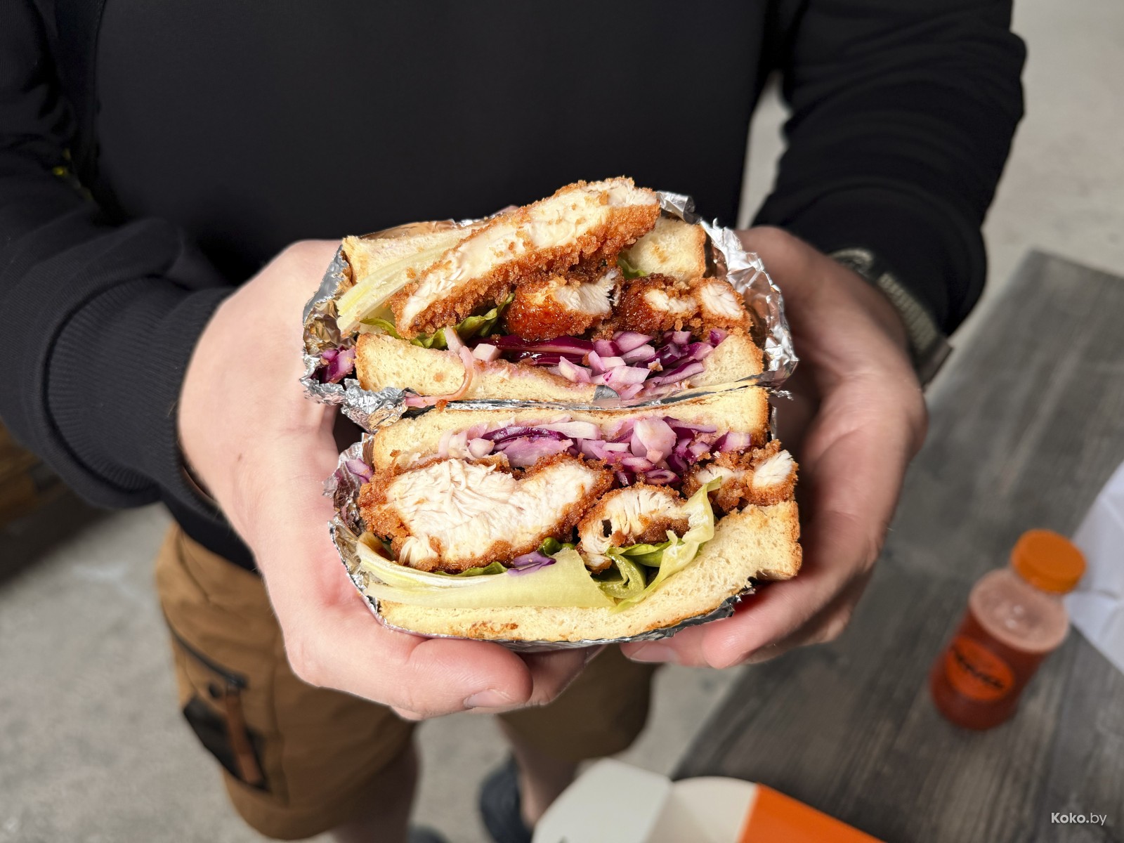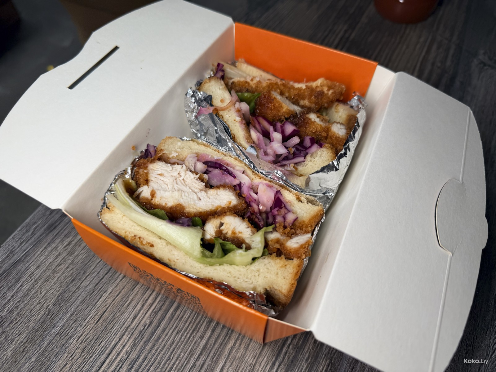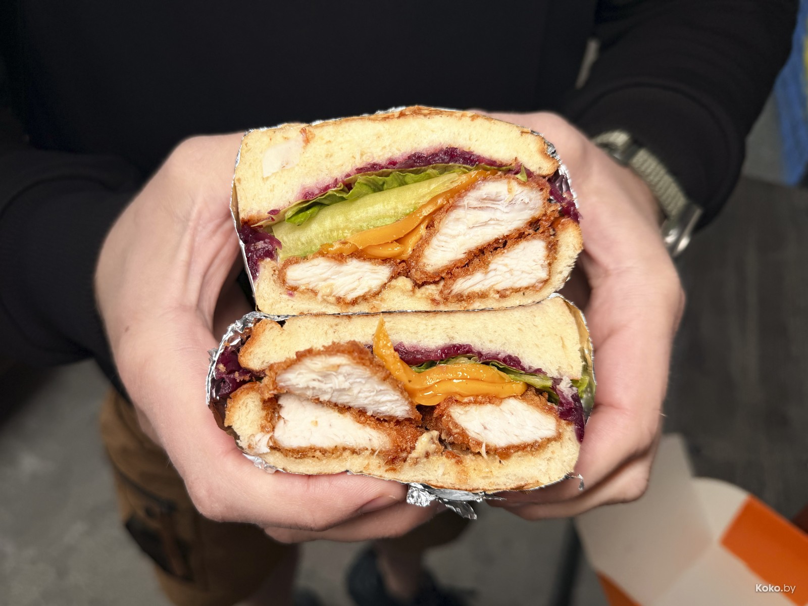 1. Сами пекут белый хлебушек: он пышный, слегка сладковатый, на сайку нашу похож, начинку выбираем мы. Самый топ из трёх жертв - трюфельный чикен-сандо за 12р с хрустящей курочкой в душистом соусе, со сладким маринованным луком и куском сыра Чеддер.