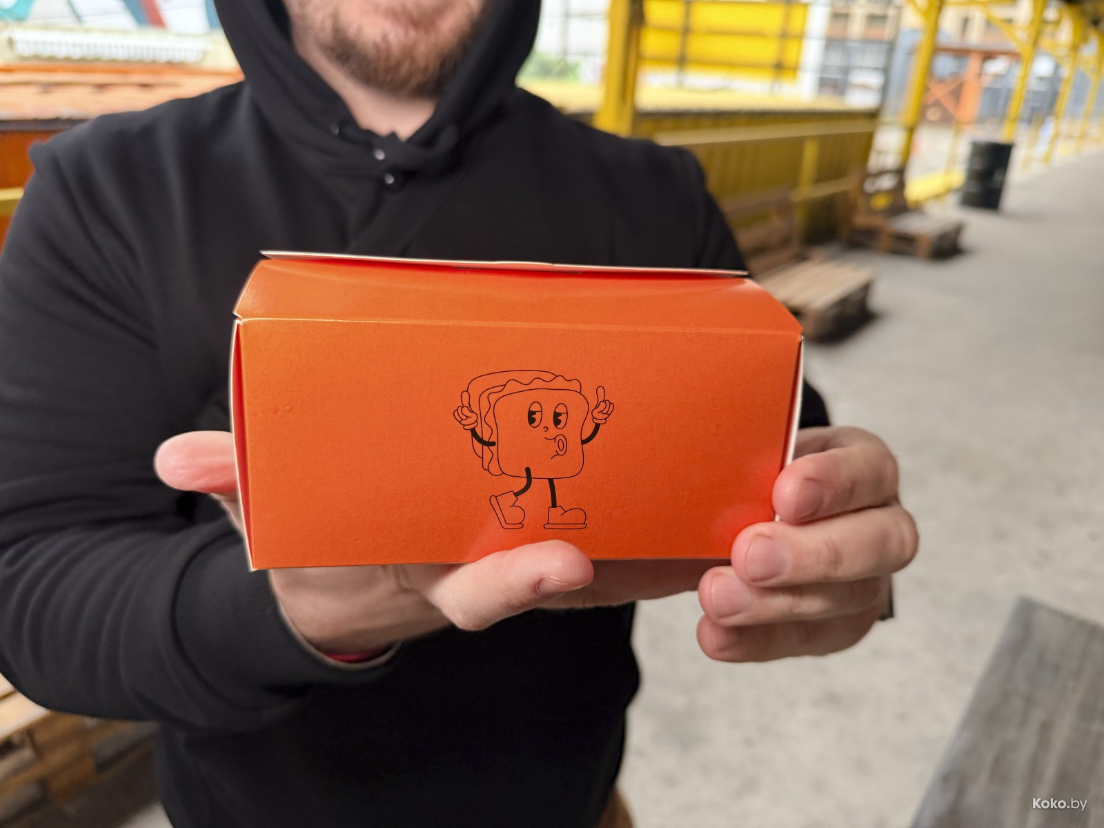 Сэндвич разрезают пополам, заворачивают в фольгу и помещают в брендированную коробку со свистящим сэндвичем. Удобно брать в гости или с собой, это они молодцы, позаботились о комфорте гостей.