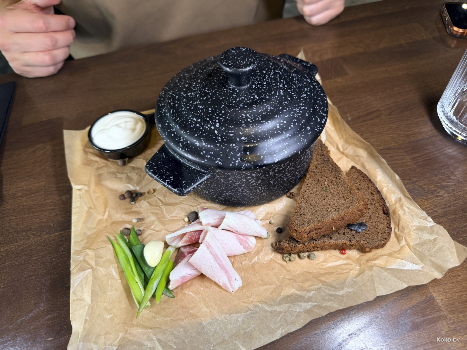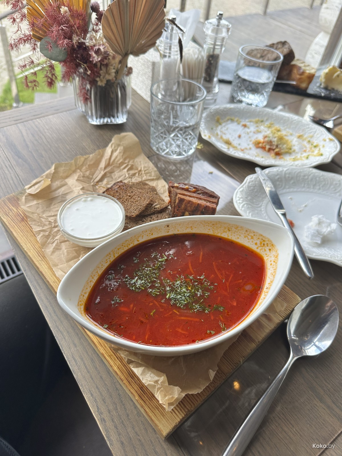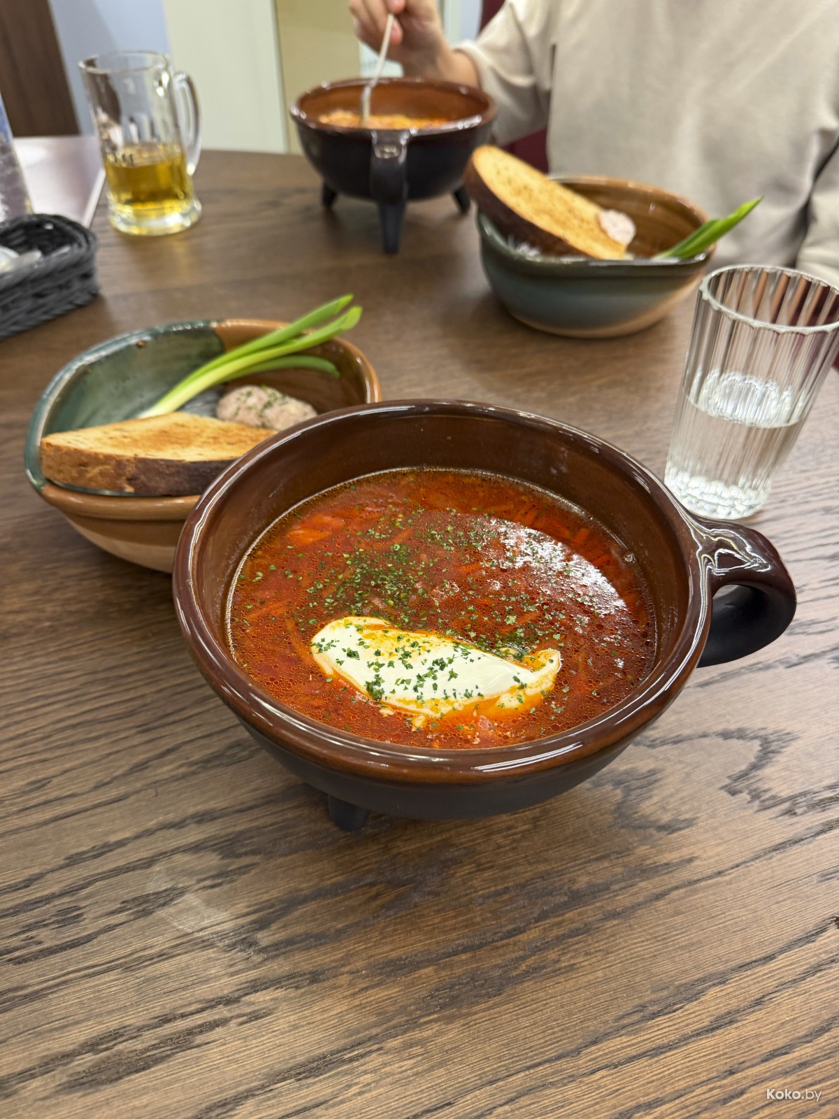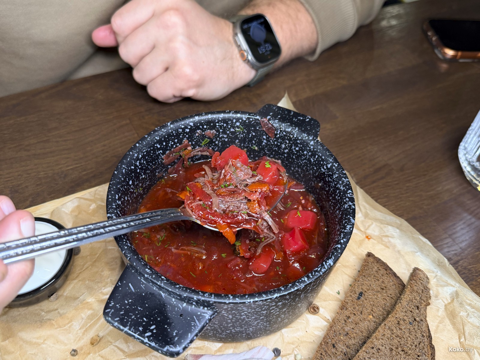 Уважаю поваров, которые украшают борщ ломтиками чёрного хлеба, стоячей сметаной, чесноком, луком и вкусным салом. В борщ смогли, он насыщенный, кисло-сладкий с невидимой жиринкой. Годнота!