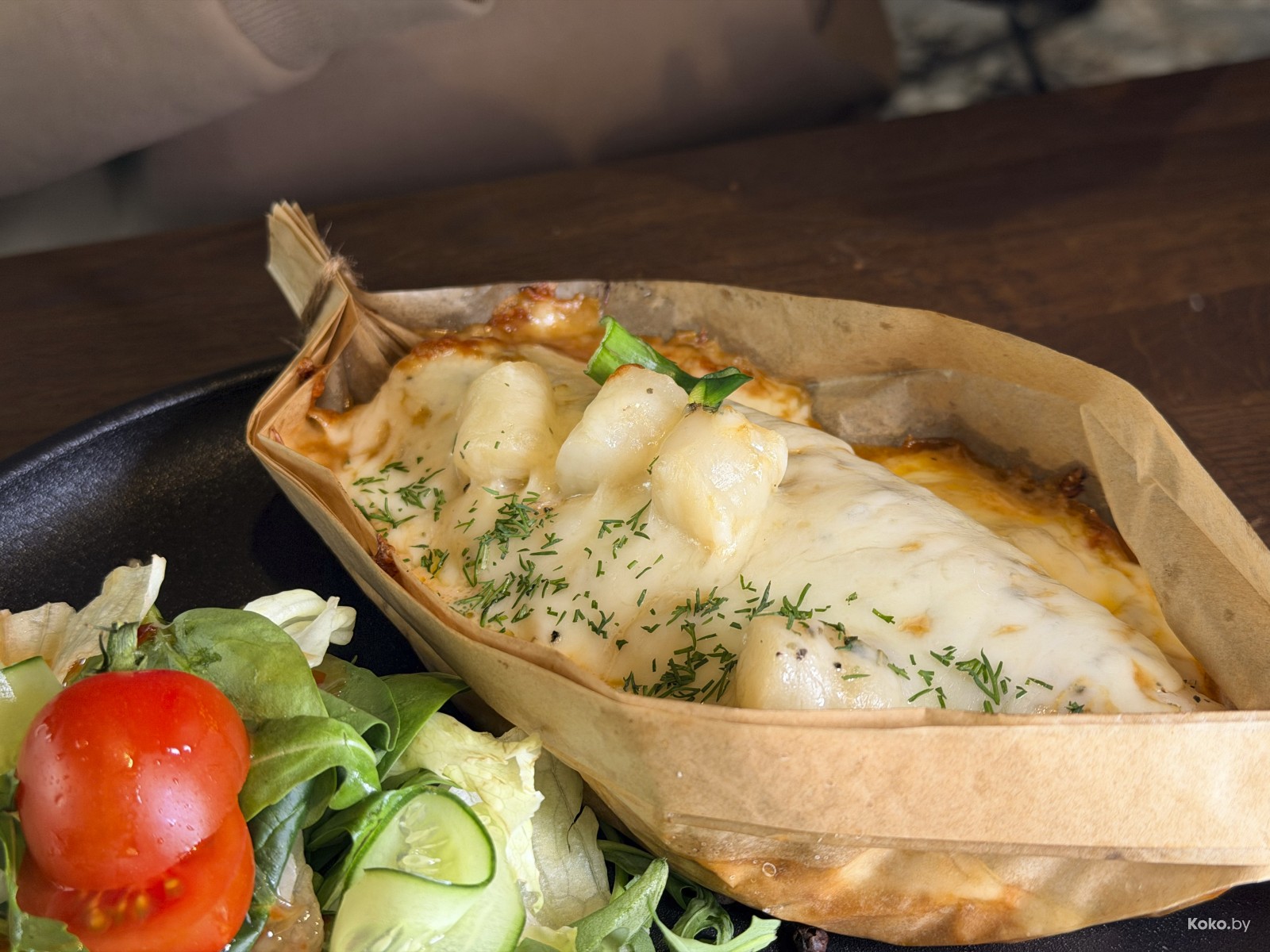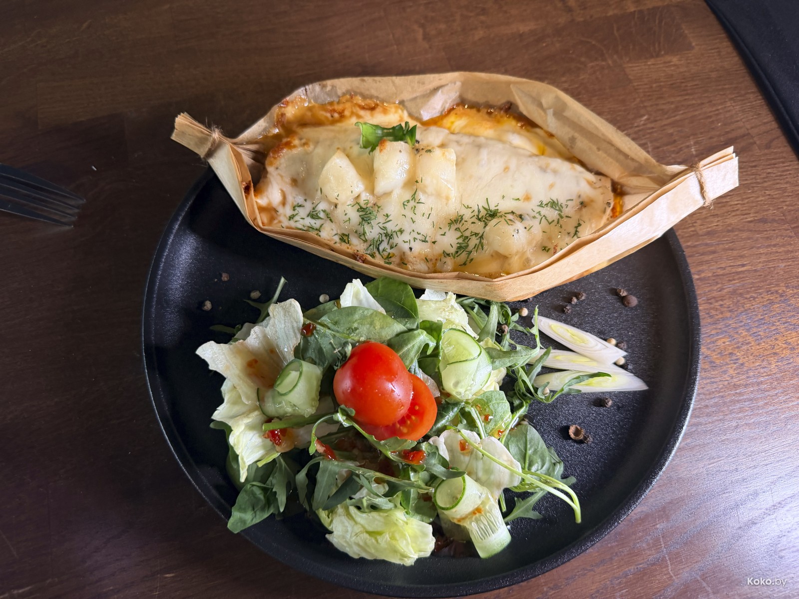 3. За 36р рыба судак по-банкетски под сырной шапочкой с бэйби гребешками, запечённый на овощах в лодочке из пергамента.