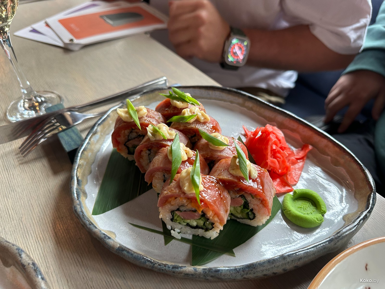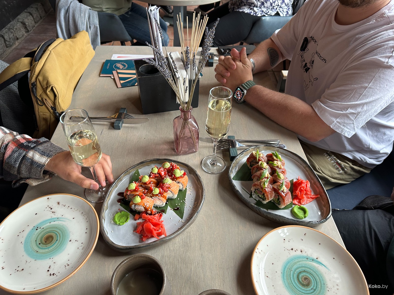 Просекко не тестил, наверное, вкусно. Два ролла идут с двумя третями гарнира: васаби и имбирь, соевый соус заказывается отдельно.