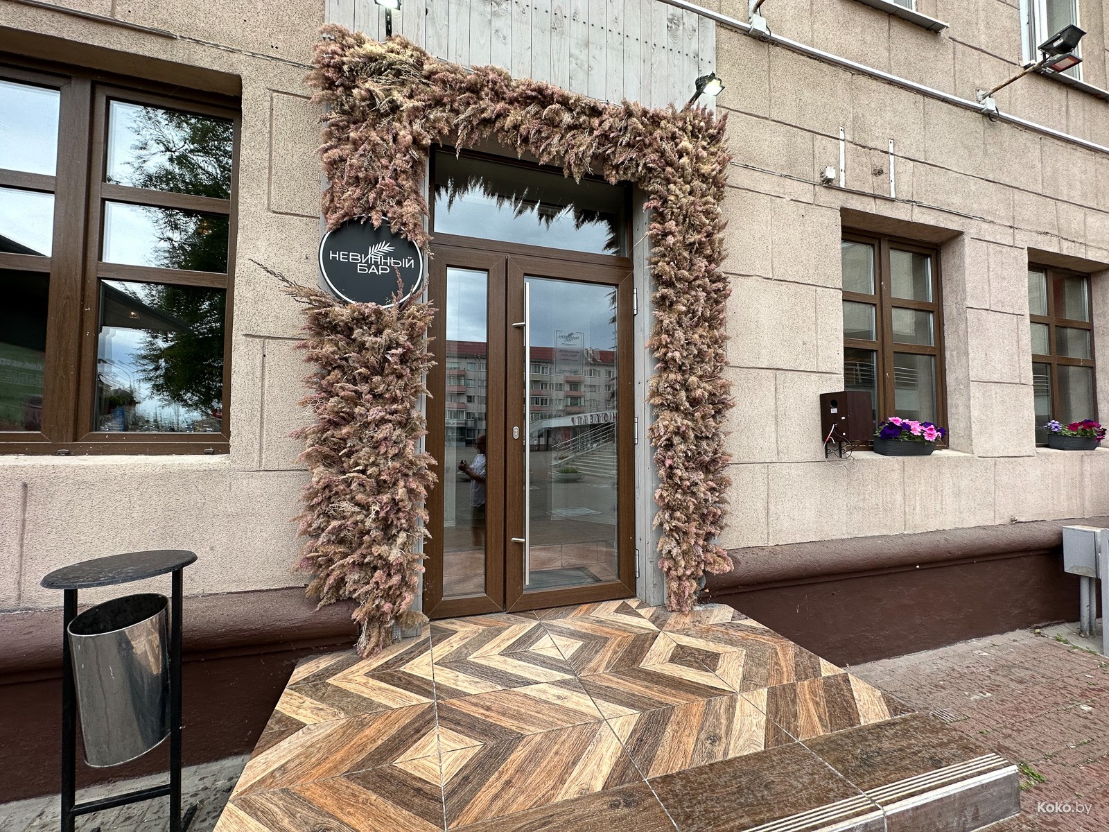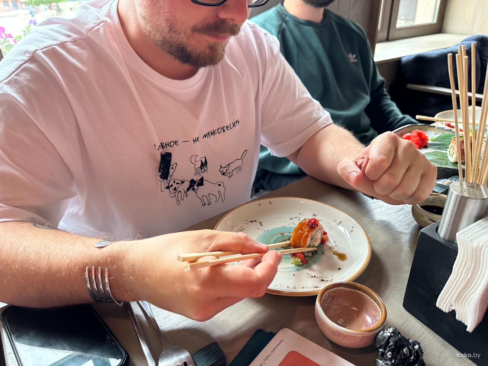Акция щедрости действует весь июнь в самые просадочные дни общепита: с понедельника по вторник с 16:00 и до закрытия. Инстаграм «Невинного бара» обещает за наши 25 рублей два ролла с какой-то рыбой и два бокала с молодым газированным вином. Чтобы всё было справедливо, мы отправили сделать заказ барсука в гражданке, а сами остались ждать команды, когда можно заходить с проверкой. Кухня не подготовилась, барсук ждал суши 44 минуты.
