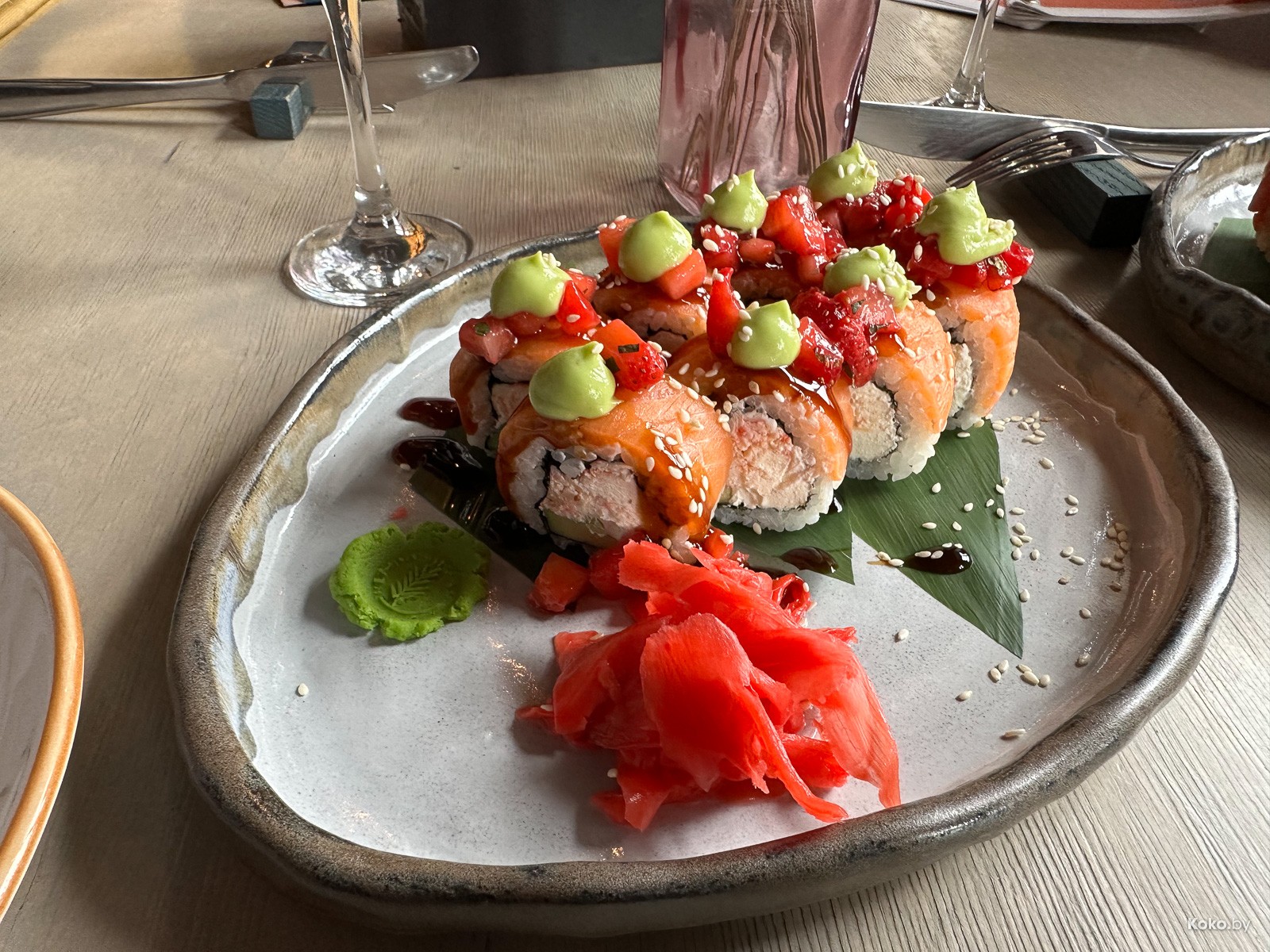 Второй ролл накрыт тонким лососем, внутри микс творожного сыра с крабовыми палочками, а сверху тартар из клубники. И опять годно!