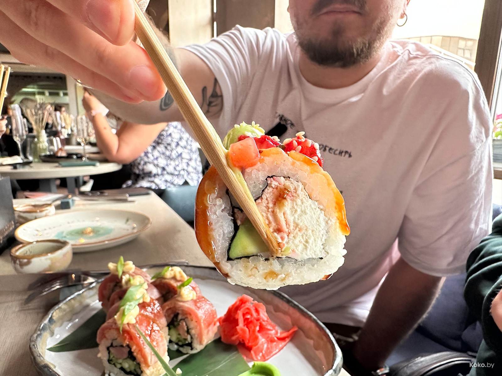 Первый ролл с куском тунца и огурцом внутри, снаружи слайсами опаленный тунец татаки под майонезным соусом. Вкусно, прям отлично.
