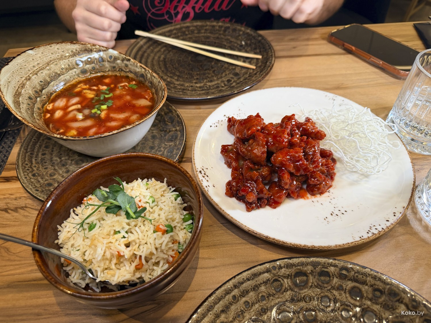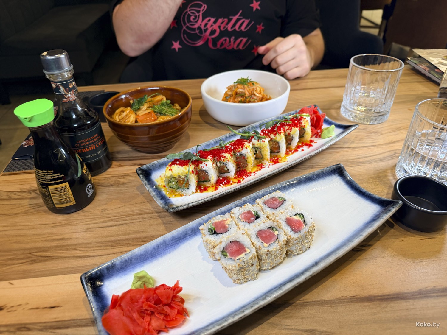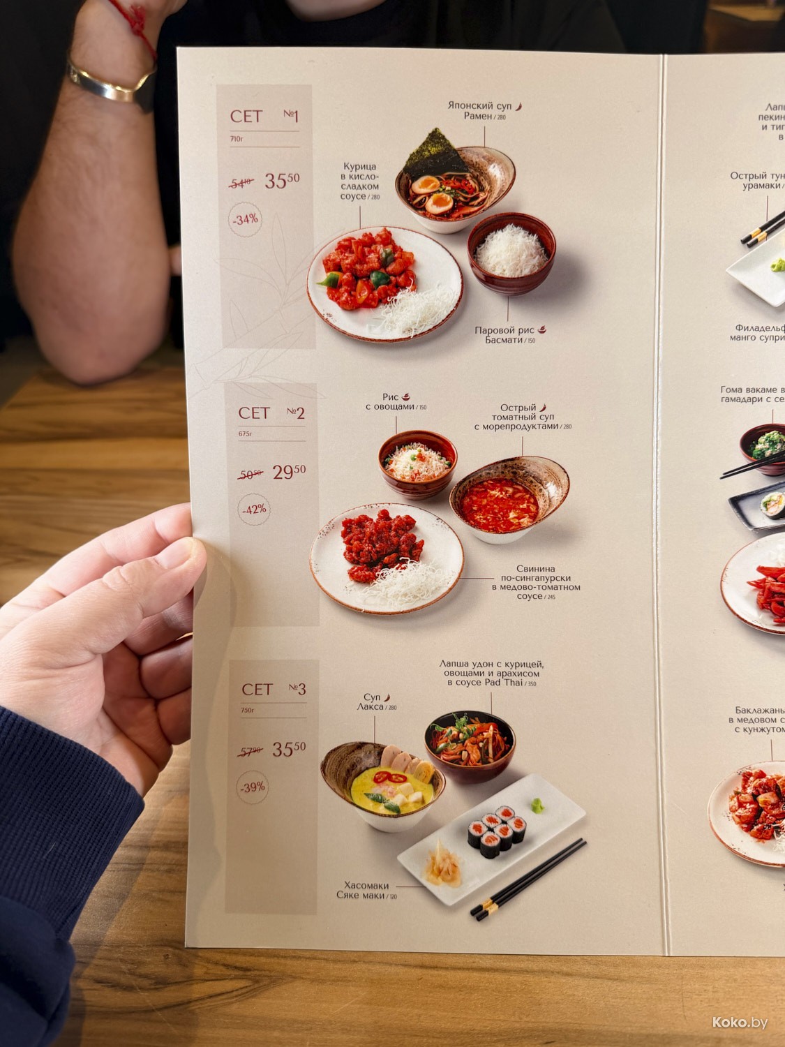 Сеты от 29,60р за острый томатный суп с морепродуктами, рис с овощами и медово-томатную свинину, до 39,50р за лапшу с тигровыми креветками, ролл с тунцом, ролл Филадельфия с манго и капусту кимчи.