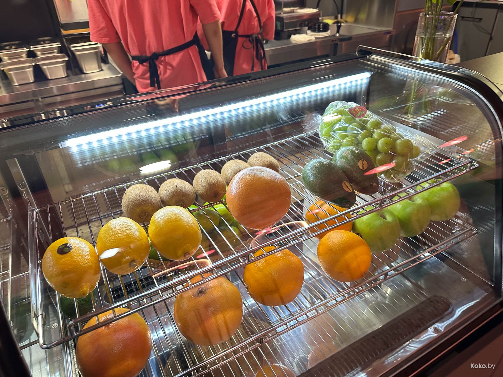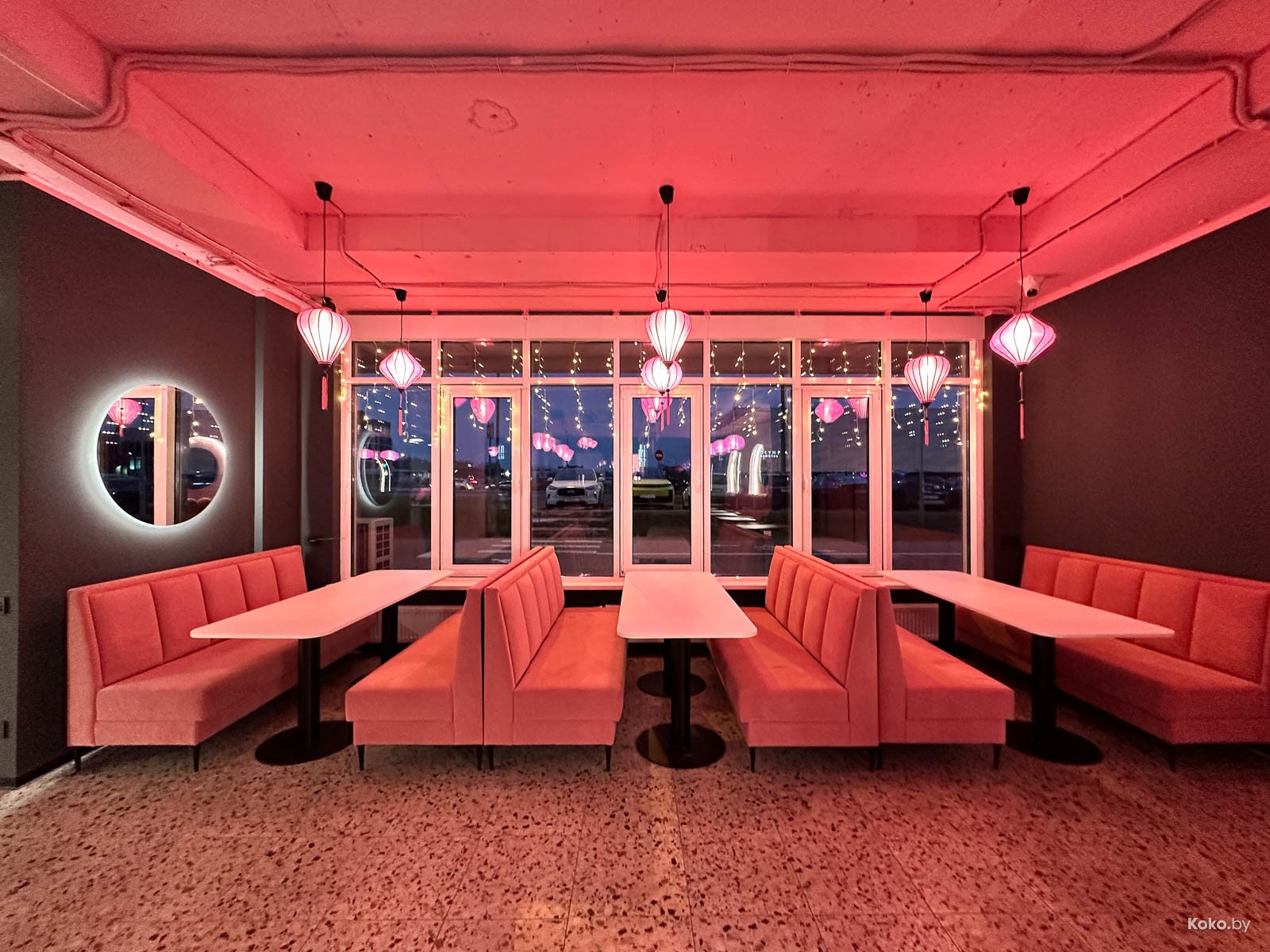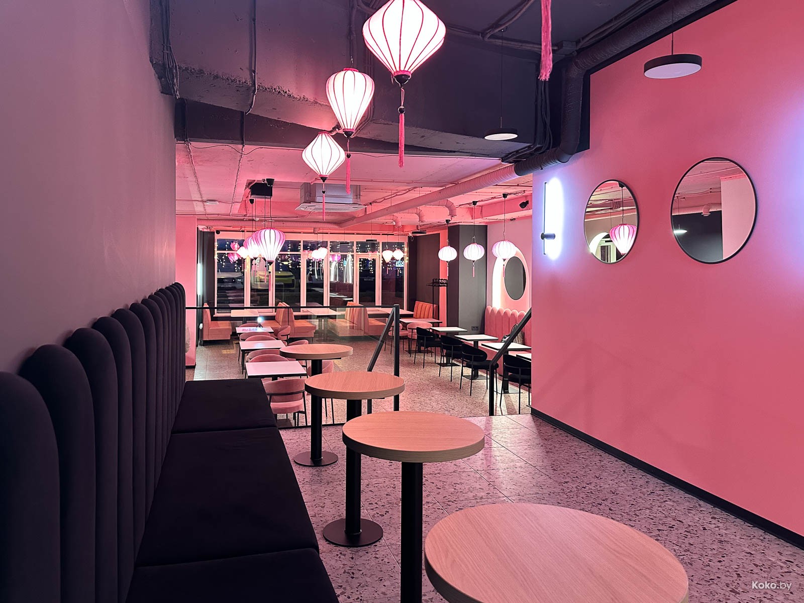 Здоровенное, как для чайной, помещение на 200 квадратов цвета Барби с фонариками на счастье и мягким всем подряд. Дизайн лого пилил известный во фруктовых кругах дизайнер Алексей Лимонов.