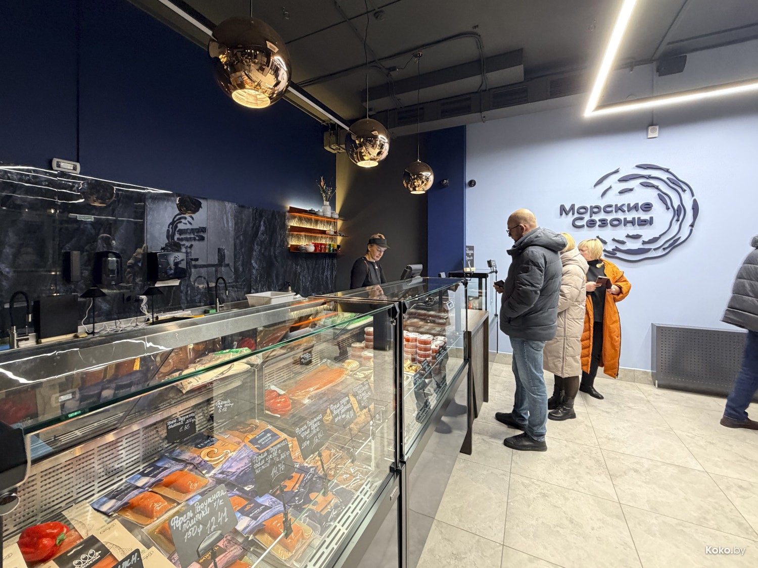 Рыбное бистро с магазином дальневосточной икры и морепродуктов открыли в здании нового «Минского технопарка», найдёт его не каждый, поэтому я проведу вас. В рыбном доме «Морские сезоны» продают свежую икру от 29,90р за 100г горбуши до 36,50р за 100г кеты, наваривают вкуснейший Том Ям за 23р по рецептам Тая, крутят суши и жарят дорадо на гриле за недорого. Сколько угодно разной красной рыбы, селёдки, скумбрии, мидий и прочих морских животных.