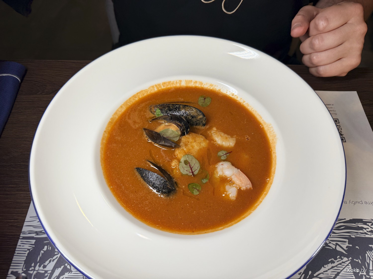 Насыщенный разной рыбой буйабес с куском жареной трески, хрустящим филе креветки и мидиями. Один в один, как в «Сифудошной» за 46р, только без хлеба и соуса ру. А ещё топовый буйабес в «Ле Шато».