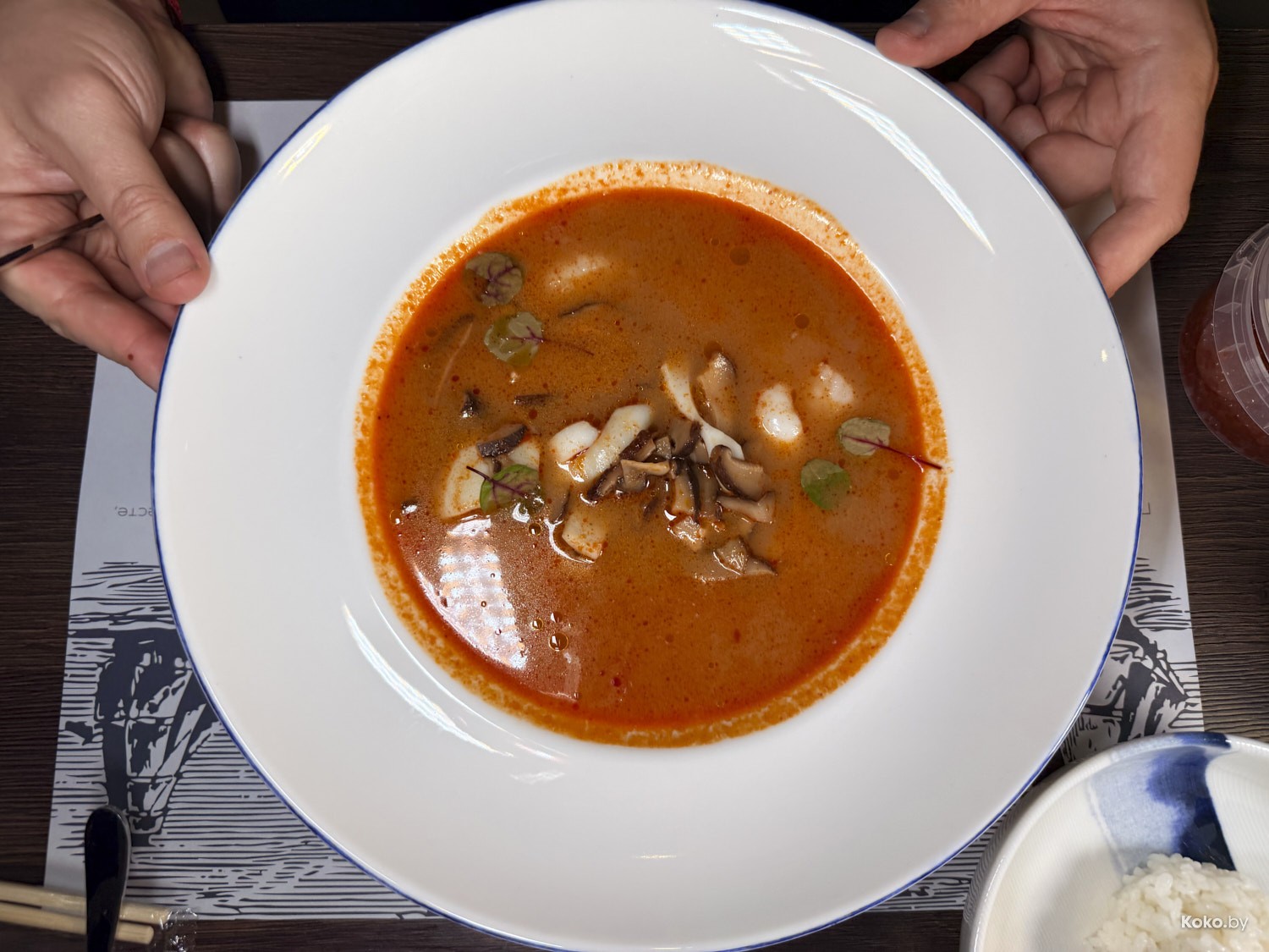 Яркий, сладко-кисло-острый, почти как Тайланде, но там зелени кладут на всю тарелку. Смело заходит в мой топ лучших Том Ямов Минска.
