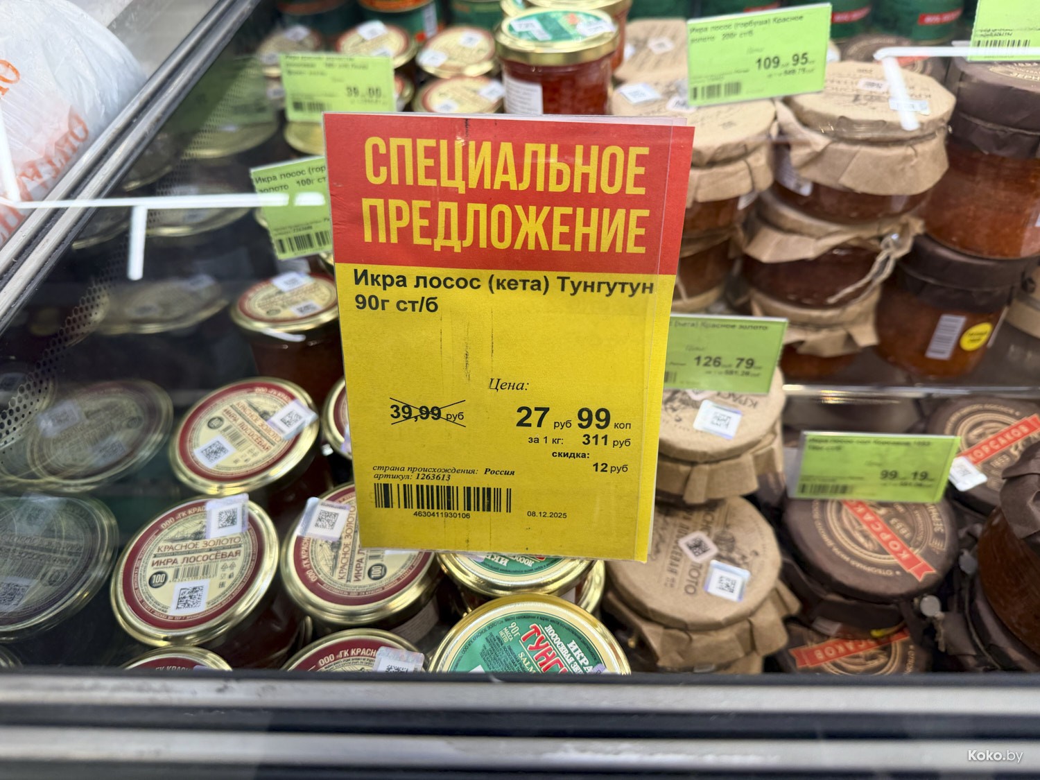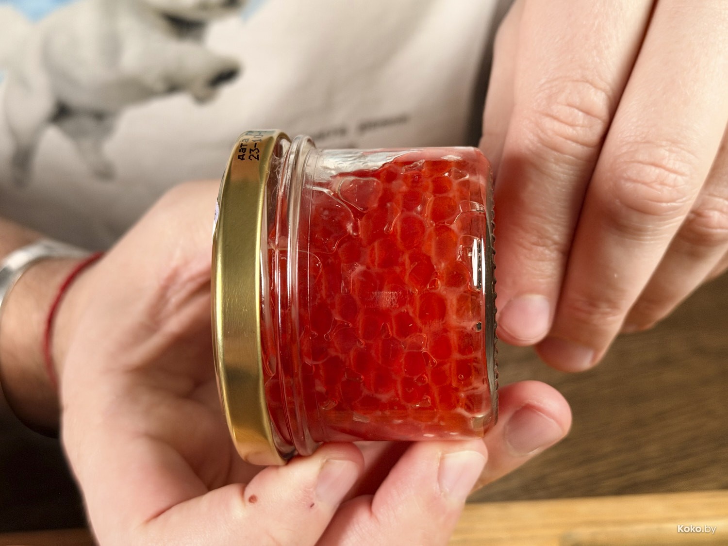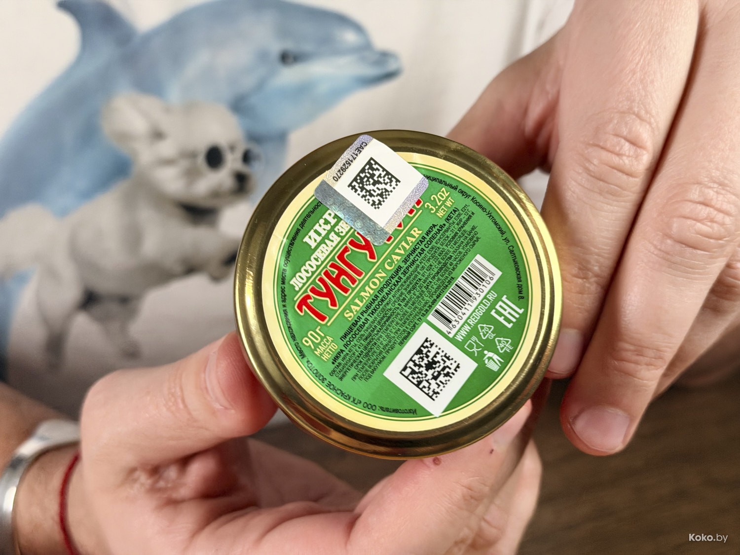 По прямой наводке мы прибыли к месту продажи, чтобы проверить, сколько хотят за красную икру с Дальнего Востока на Новый год. Наблюдаю три вида камчатской икры: «Тунгутун» в стекле 90г кеты на акции за 27,99р, «Красное золото» 100г от горбуши за 49,99р и в крафтовой бумаге Красное золото 200г за 109,95р. Интересный факт, красная икра добывается всего лишь один раз в год во время нереста лососёвых, её извлекают из рыбы, сразу же солят и консервируют.