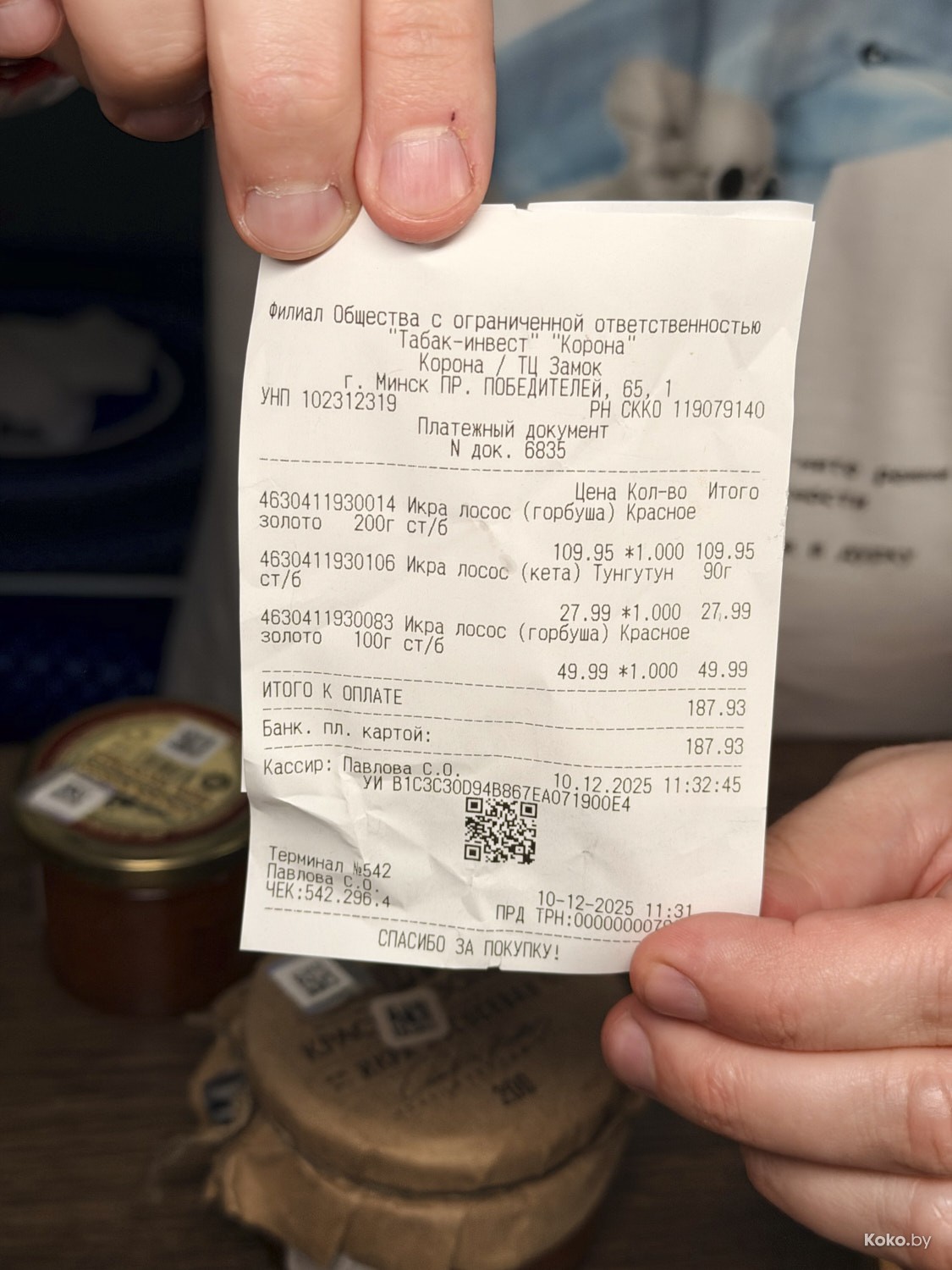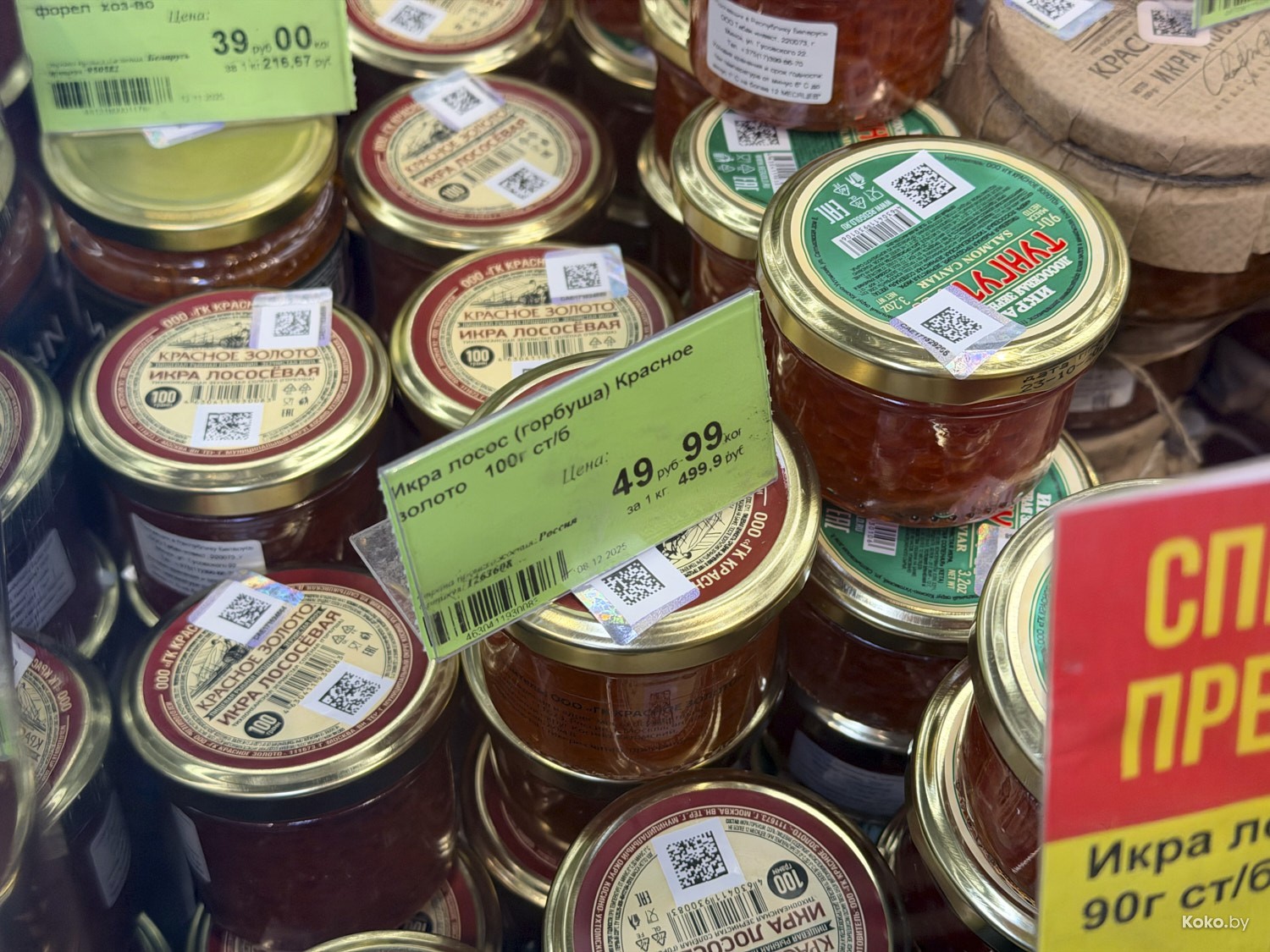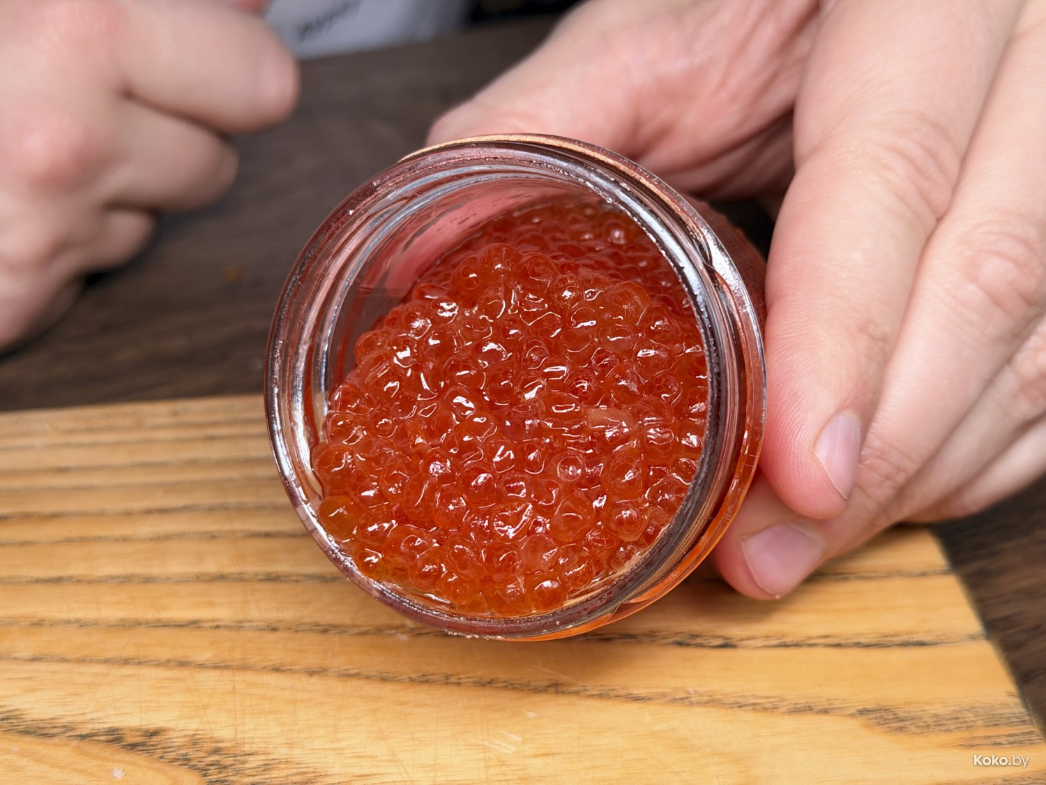 По прямой наводке мы прибыли к месту продажи, чтобы проверить, сколько хотят за красную икру с Дальнего Востока на Новый год. Наблюдаю три вида камчатской икры: «Тунгутун» в стекле 90г кеты на акции за 27,99р, «Красное золото» 100г от горбуши за 49,99р и в крафтовой бумаге Красное золото 200г за 109,95р. Интересный факт, красная икра добывается всего лишь один раз в год во время нереста лососёвых, её извлекают из рыбы, сразу же солят и консервируют.