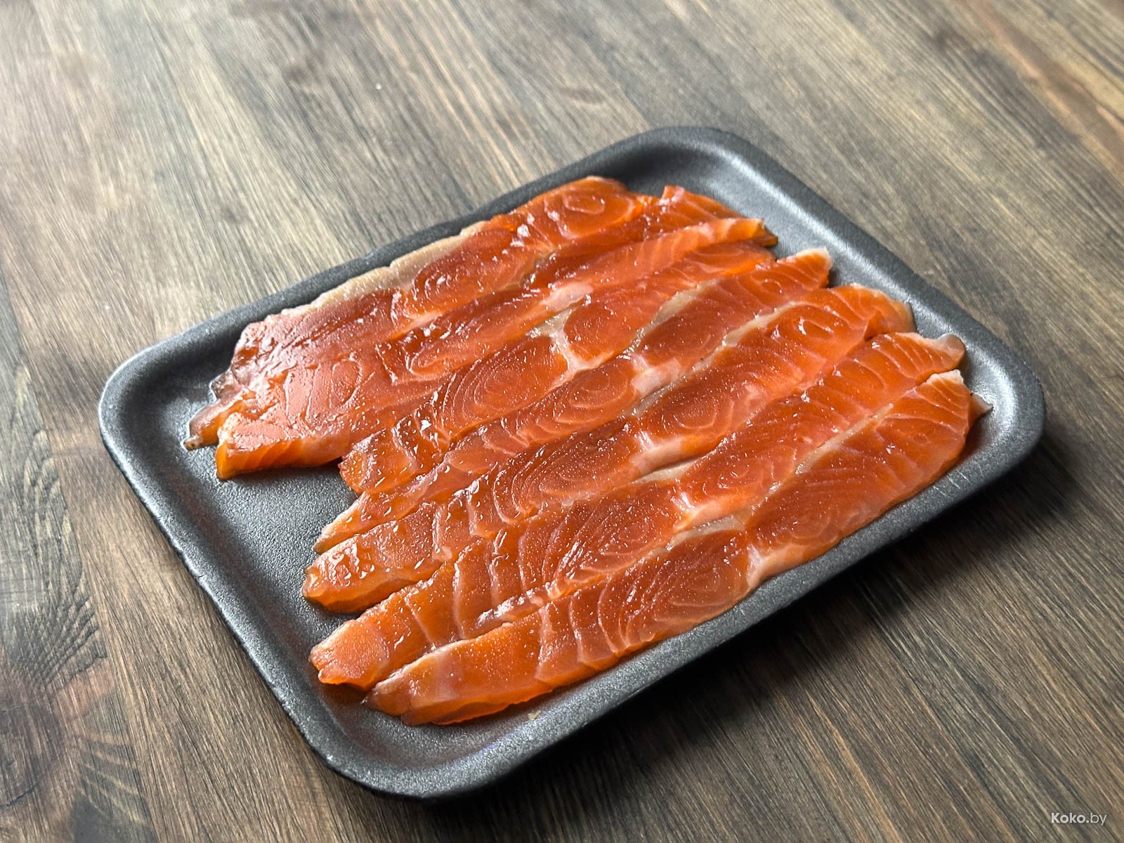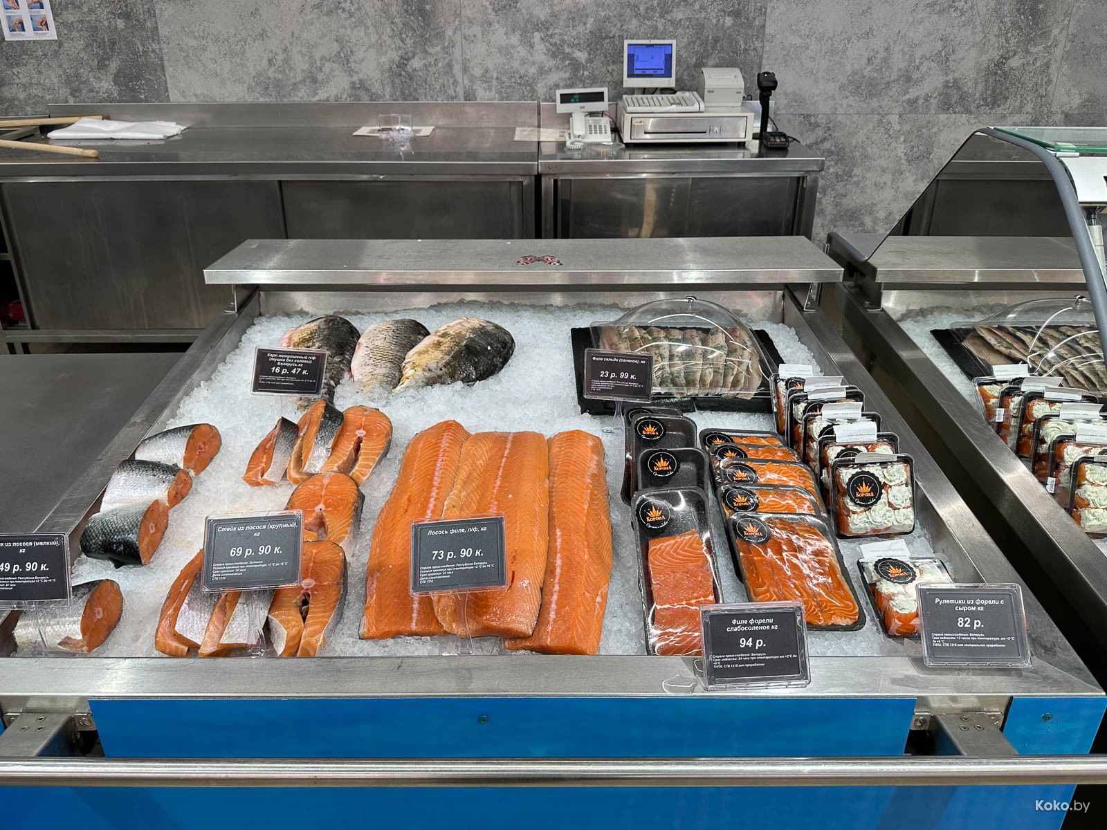 Свежий лосось филейной частью по 73р с почищенным карпом и посоленной к картошечке селёдкой ждут на льду. Рядом уже порезанная на бутерброды красная рыба своего посола по 10р за пачку - беру!