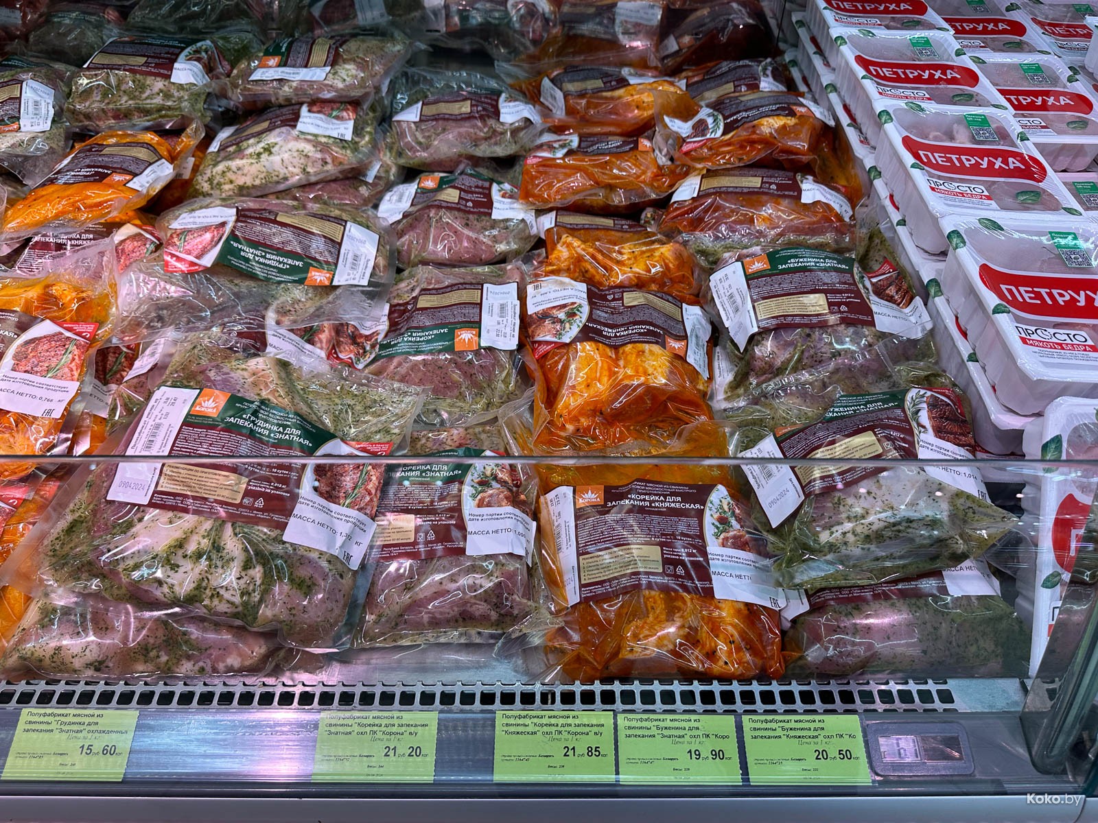 Всё для Минского моря от 12,99 до 21,99р за килограмм свиной корейки в маринаде по-нарочански. Шашлык выглядит крайне бодро.