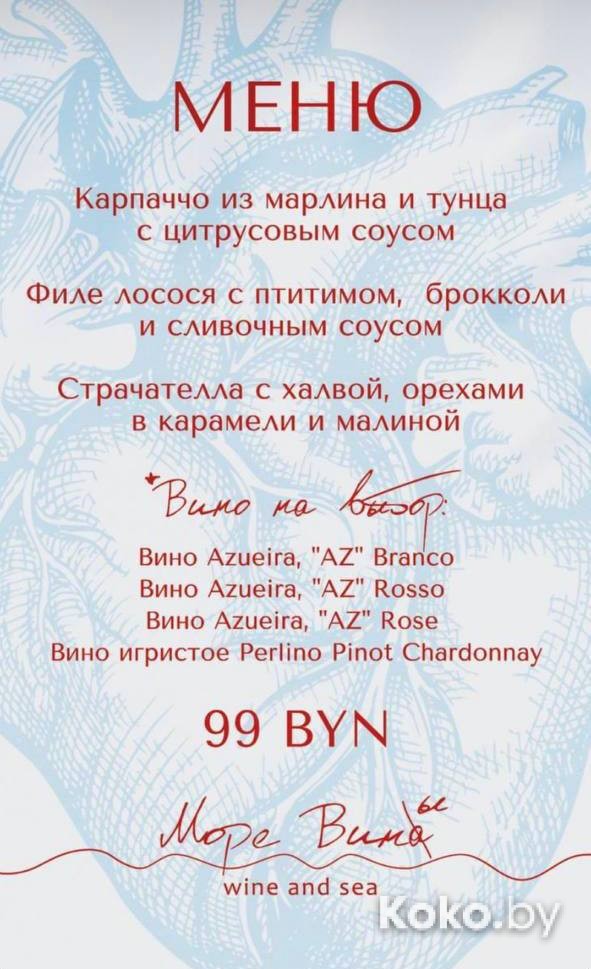 5. В новом винном баре «Море Вины» сет на двоих стоит 99byn. Туда входит три полноценных закуски и одна бутылка вина на выбор!