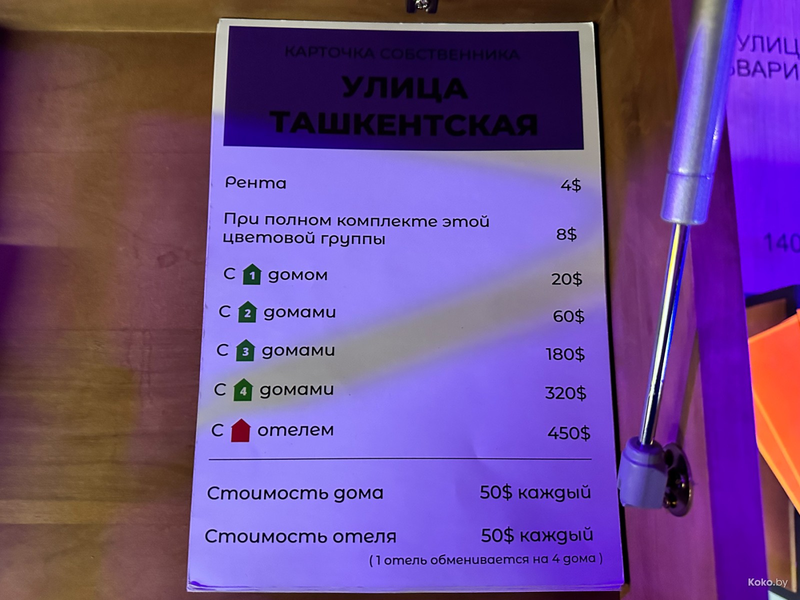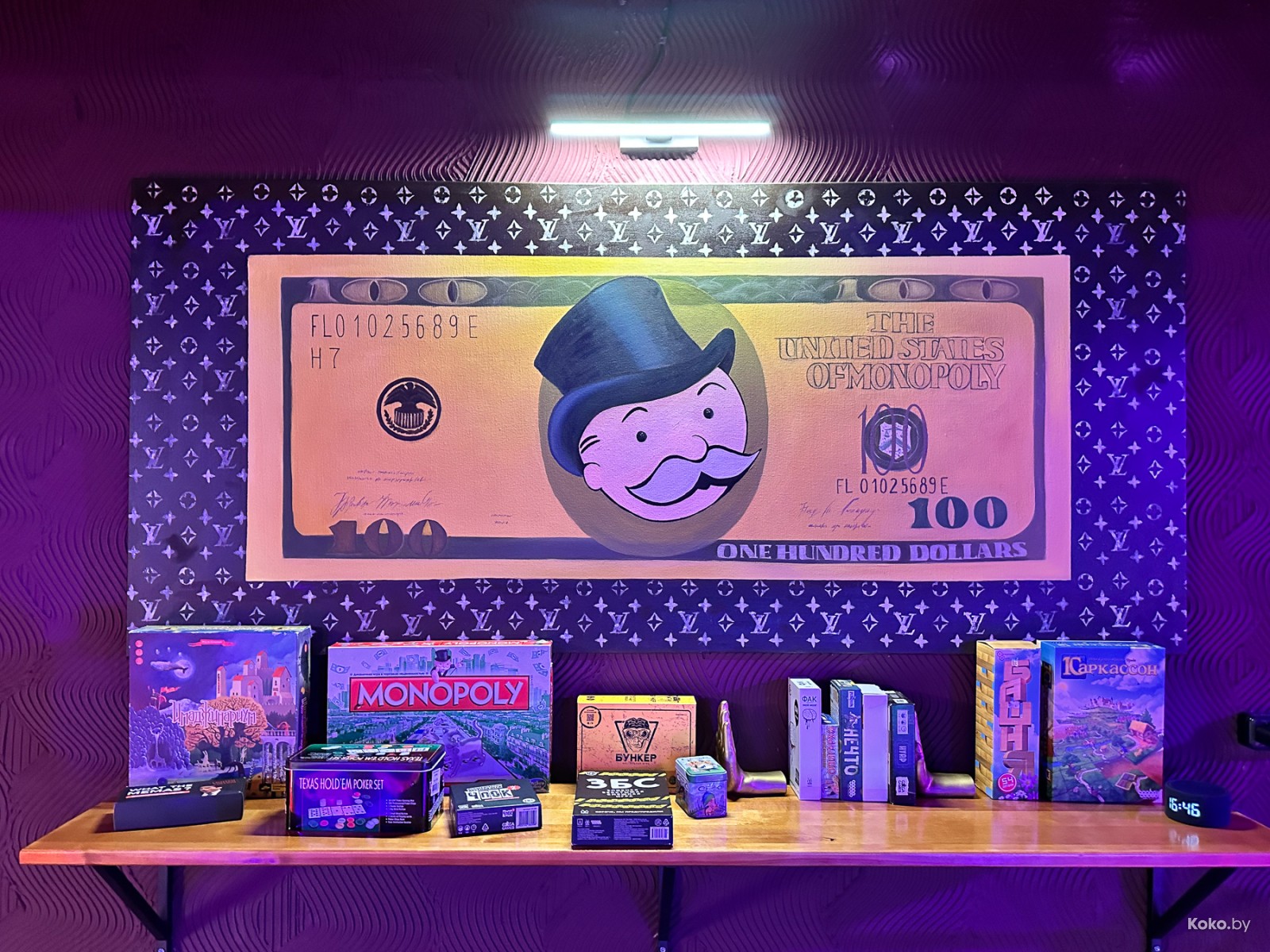 Всё съедобное и попить разрешают приносить с собой, кроме «Монополии» имеется караоке, большая дженга и столы на ловкость.