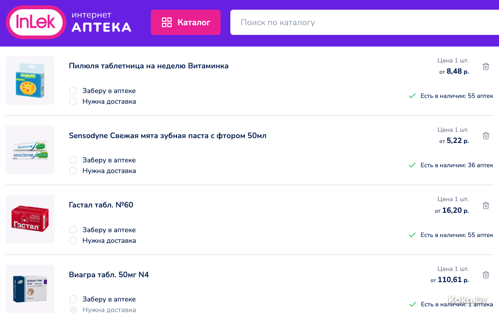 Работает по принципу, как суши домой заказать. Открываем сайт аптеки-онлайн, выбираем, что хотим увидеть дома, на всякий случай рекомендую сравнить цены через «Таблетка.бай». Далее выбираем доставку или забронировать заказ и забрать самому, всё, ждём звонка из колл-центра. Бесплатная доставка от 40р по Минску и окрестностям, заказать можно лекарственные препараты, косметику, медицинскую технику, но не БАДЫ и всё то, что по рецепту врача.