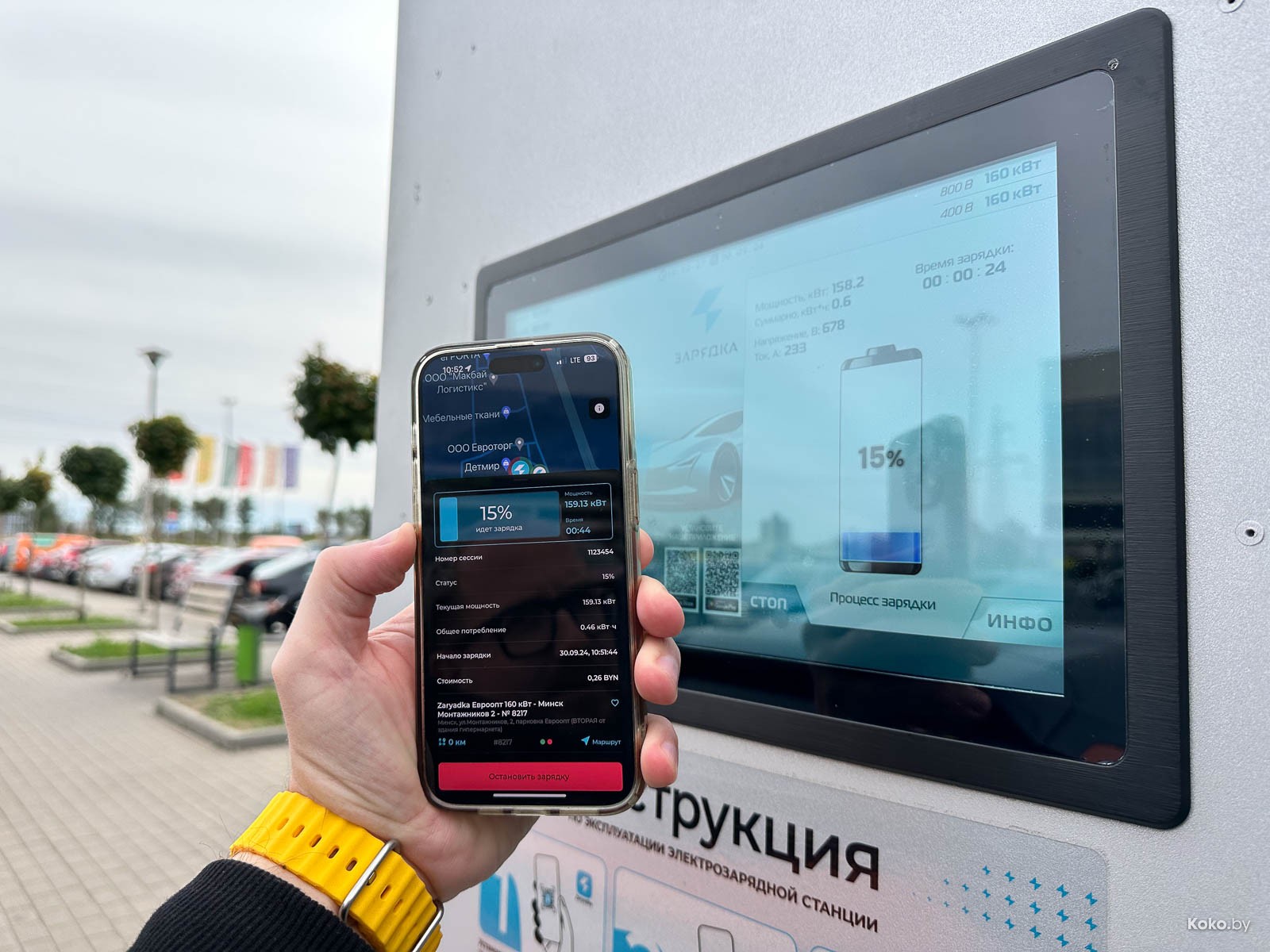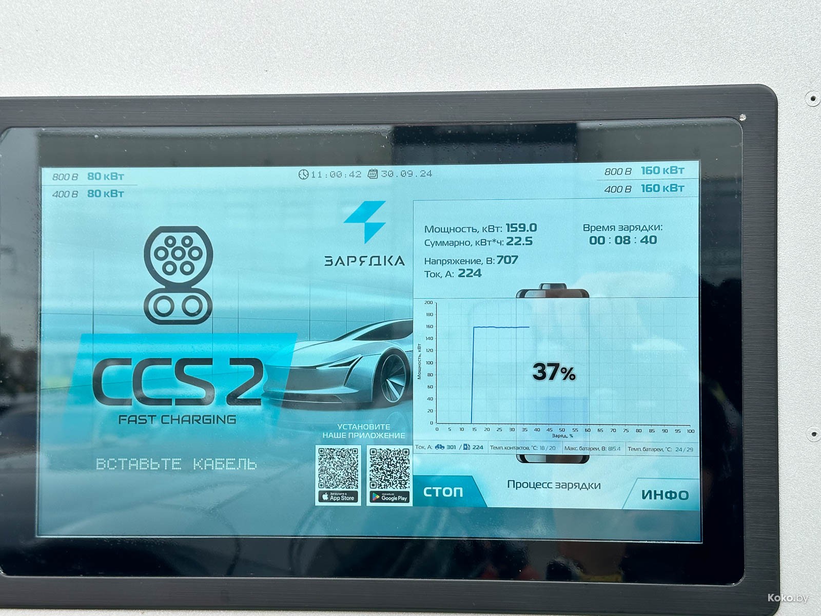 С утра пораньше нашли сразу две штуки мощностью по 160 кВт, стильные шкафы цвета неба не заметить сложно. Быстро пробежался по инструкции, полностью белорусское ноу-хау, скачал приложение через QR-код, быстро зарегился и вставил зарядку. Зарядка началась в три клика, по приложению Zaryadka вопросов не имею. Волнуетесь? Часы показали результат: за 20 минут плавно зарядила половину батареи Зикра - это 50 кВт, каждый киловатт по 56 копеек. Работает!